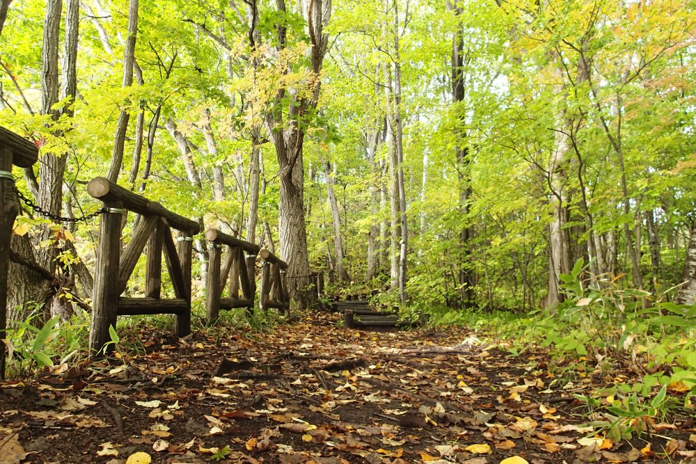 散策路からは紅葉し始めた木々が目立ち始め、落葉した木々の隙間から日の光が入り林床が明るく感じられます。