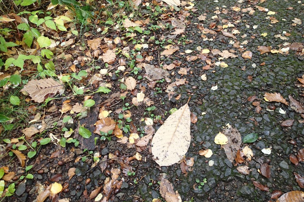 散策路を落ち葉が埋め尽くす前に、ドングリがいっぱいです。ドングリの周りには人の顔ぐらいある大きなホオノキの葉っぱやドングリの木、ミズナラの葉っぱも落ちています。