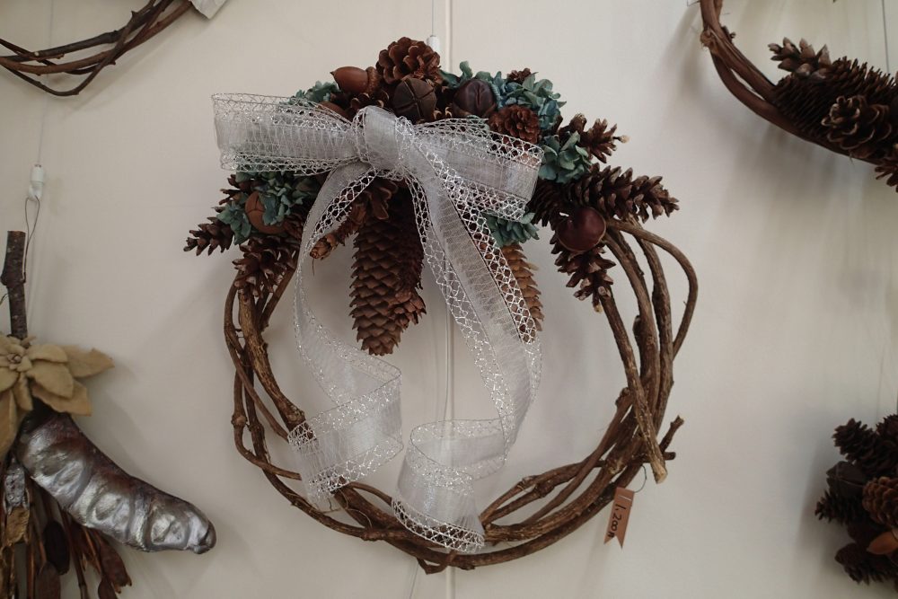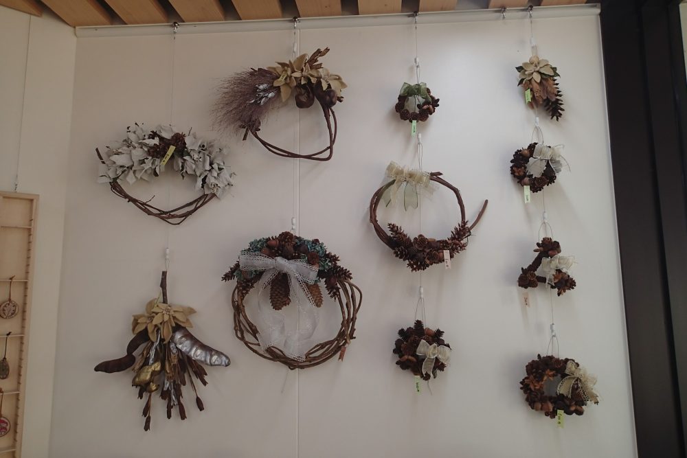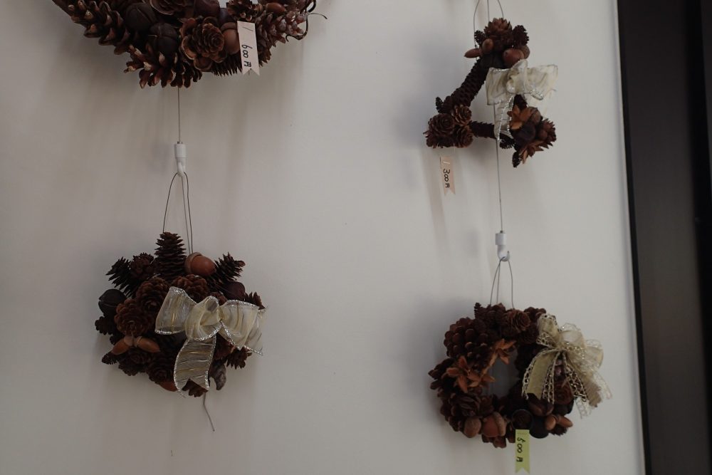 現在は木の実を中心としたナチュラルリースの販売を行っています。値段は一番小さなサイズで直径10cmほどの100円~取り揃えております。↓こちらの写真では右から2列目の一番上が100円のリースとなります。