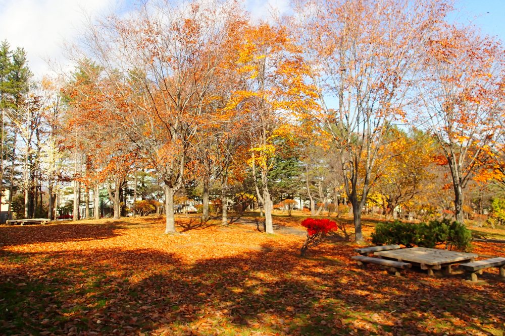駐車場から管理事務所に向かう途中にある花木広場では、ブナの木の艶やかな茶色の絨毯が広がっています。