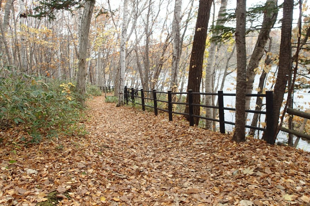 もちろん園路も落ち葉でいっぱいです。元の園路の幅が分からないぐらいです。雨や朝晩の気温差で濡れると滑りやすくなりますので、ご通行の際にはくれぐれも足元にご注意ください。