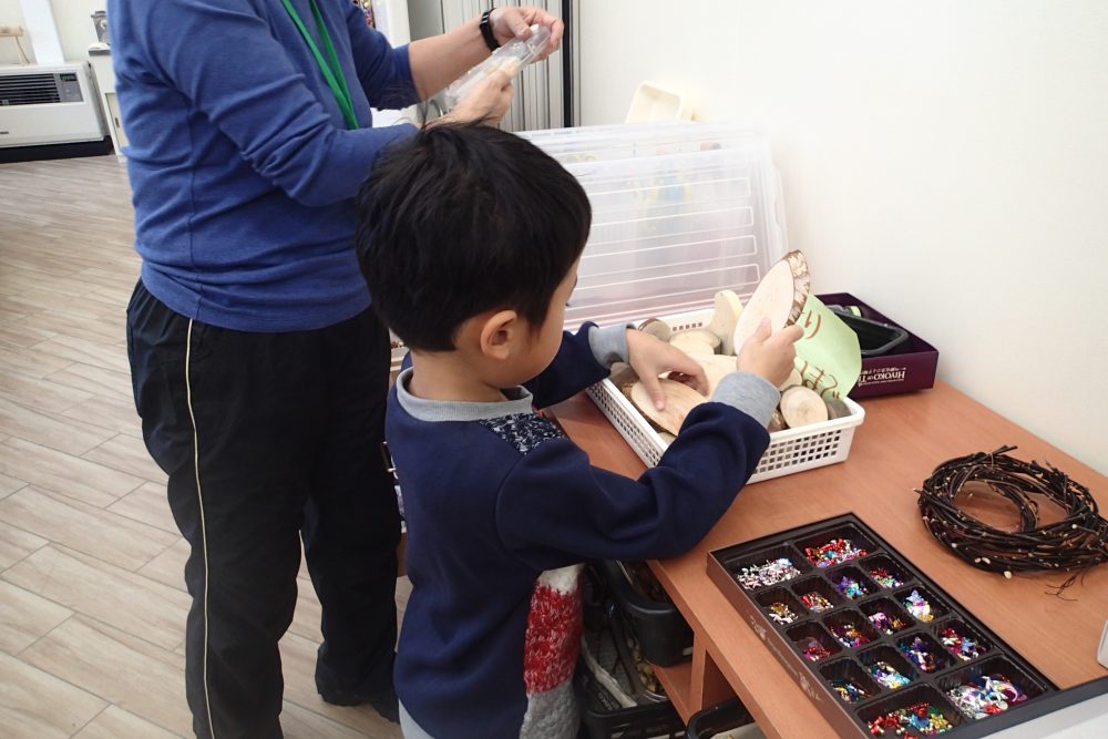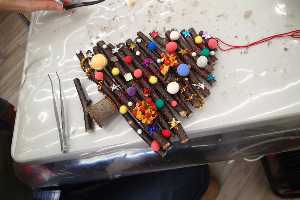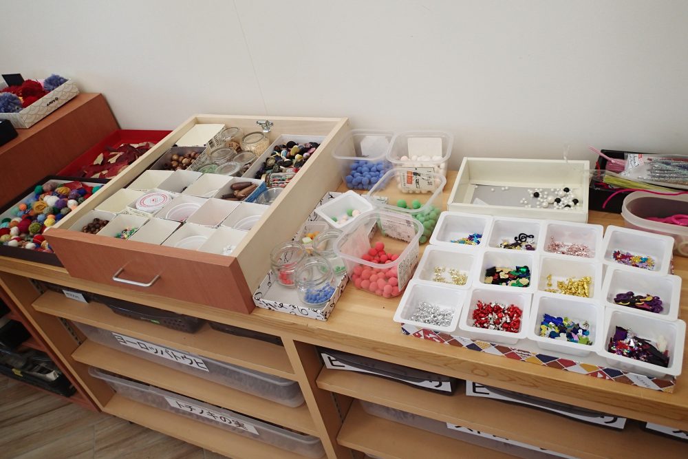 今回はキラキラカラフルなパーツもご用意しました。ビーズやモール、毛糸のボール、スパンコール、リボン、紅葉した葉っぱの押し花などなど。