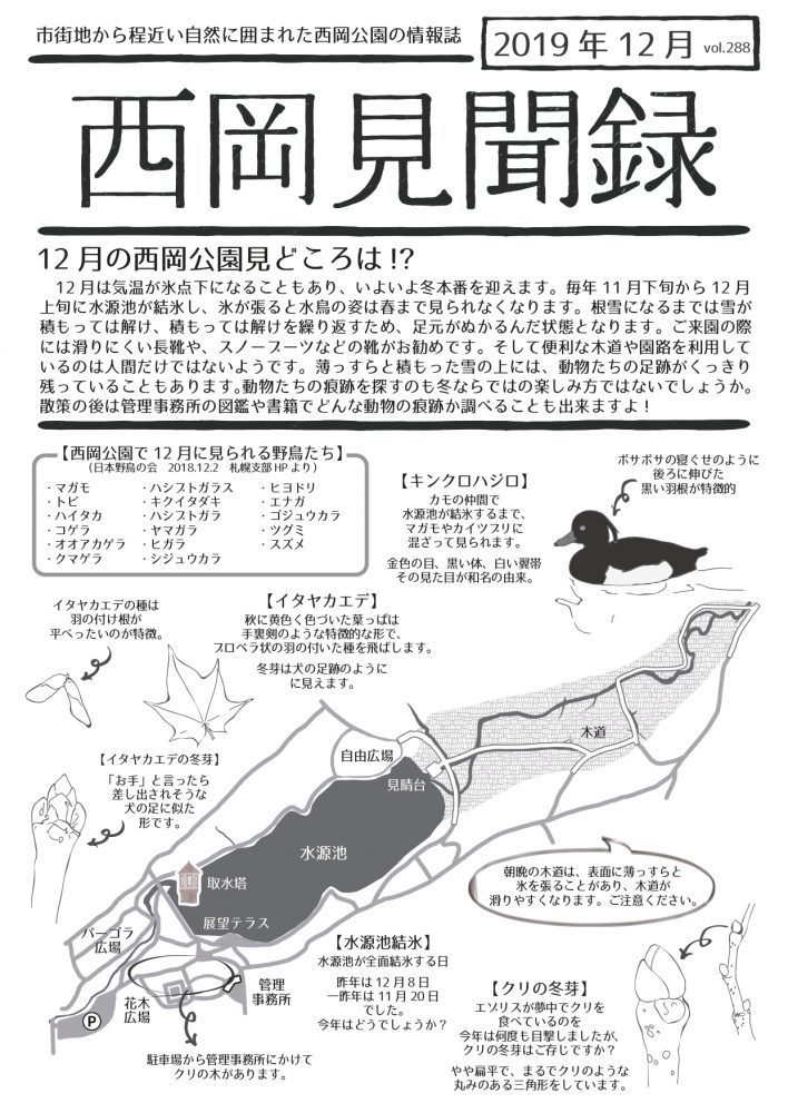 今月の表面には、晩秋に見かけた木々の冬芽の紹介や水源池の結氷まで見られる水鳥の紹介をしています。