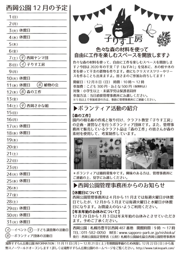 裏面では、子りす工房開催のお知らせと西岡公園のボランティア活動、管理事務所からのお知らせなどをお伝えしています。