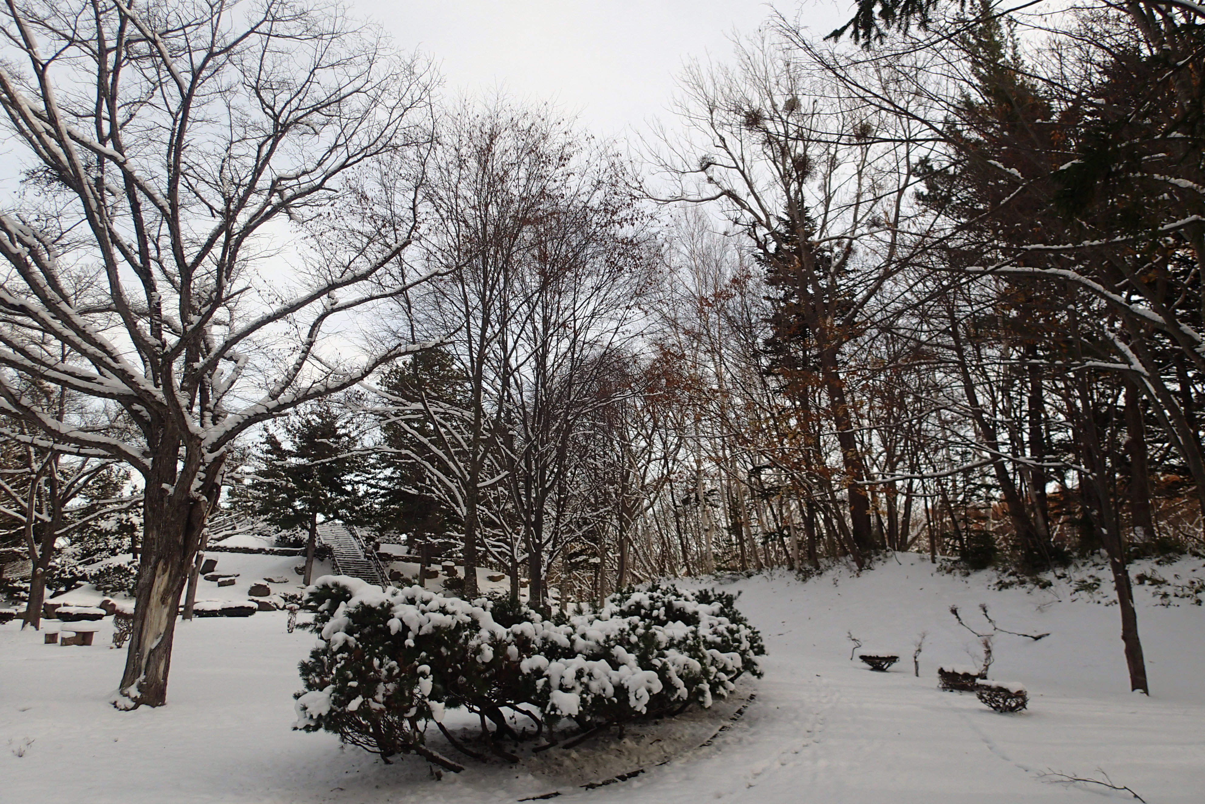 園内はすっかり一面の雪景色と変わりました。気温が低い日が続いているため雪はザクザクとしています。