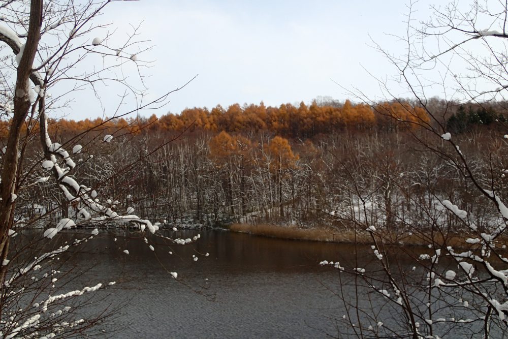園内のほとんどの木が落葉し、真っ白な景色の中でカラマツが黄金色に輝いています。展望テラスや園内西側の散策路から見下ろすように眺めるのがお勧めです。