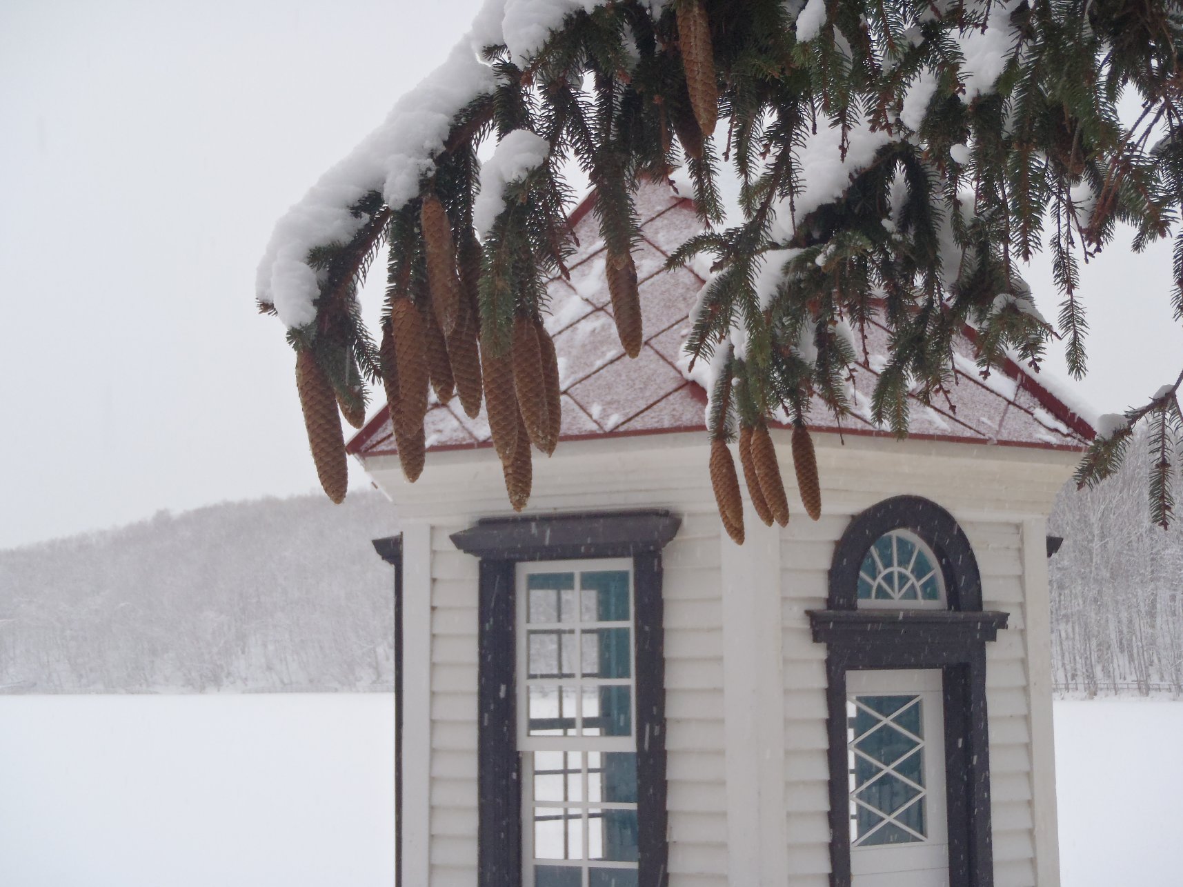 赤い屋根に、マツの緑、白い雪で、なんだかクリスマスみたいですね。