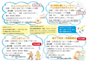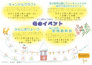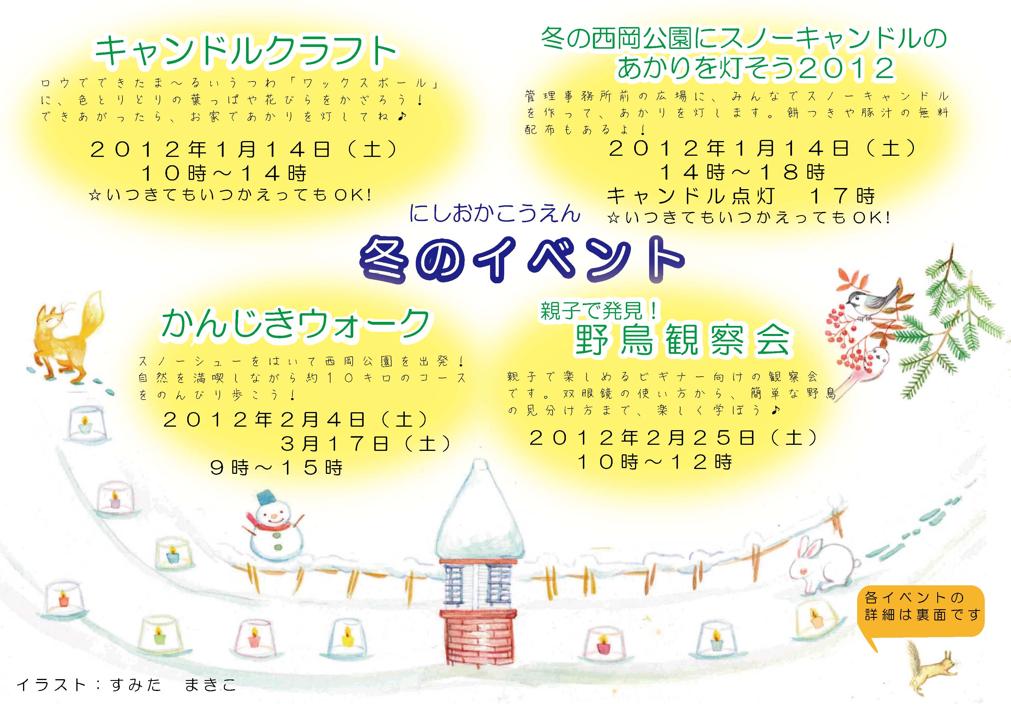 今年も、「キャンドルクラフト」「冬の西岡公園にスノーキャンドルのあかりを灯そう2012」 「かんじきウォーク」「親子で発見!野鳥観察会」と、4つのイベントを行います。 どれも、冬の西岡公園を満喫できる楽しいイベントです!