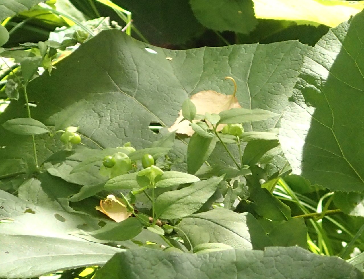 フキの葉の上でつやつや光っているのはナンバンハコベの実。
