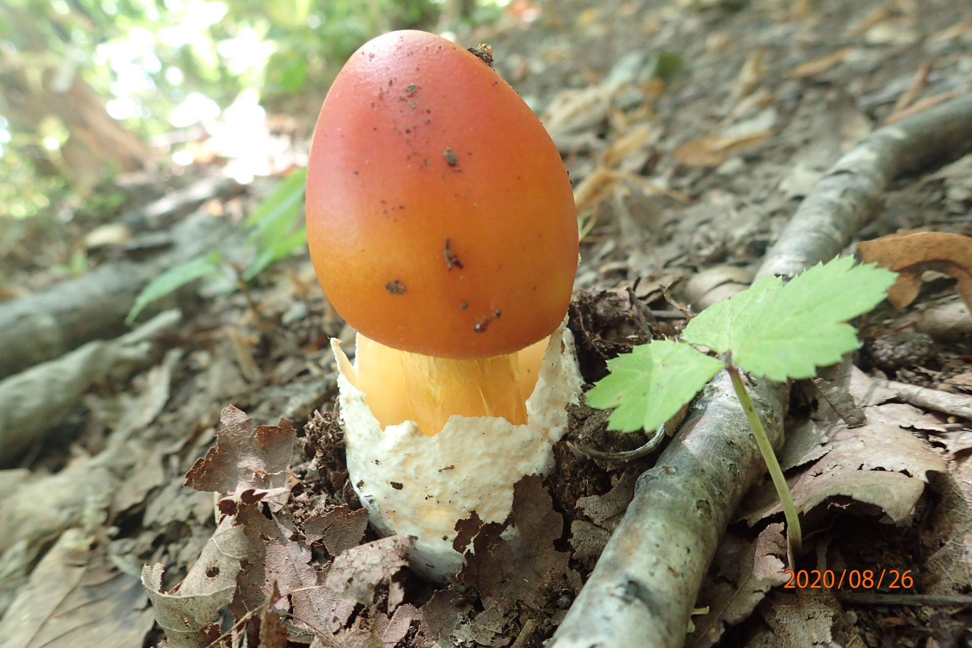タマゴタケ。白くて卵型の幼菌が割れて赤っぽい傘が出てきたところです。これも見つけると嬉しくなります。