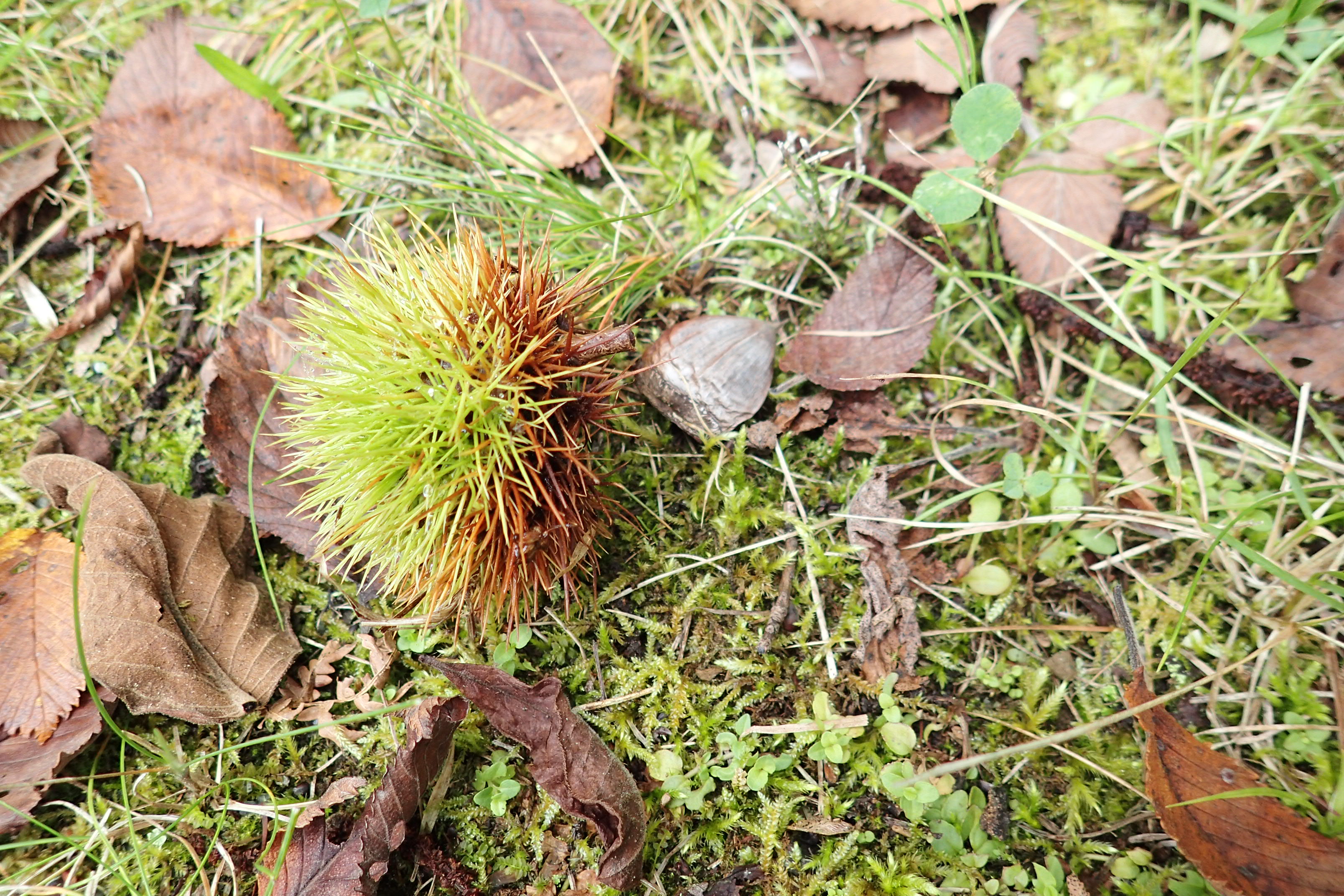 クリ。緑色のイガも日にちが経つとだんだん茶色くなります。