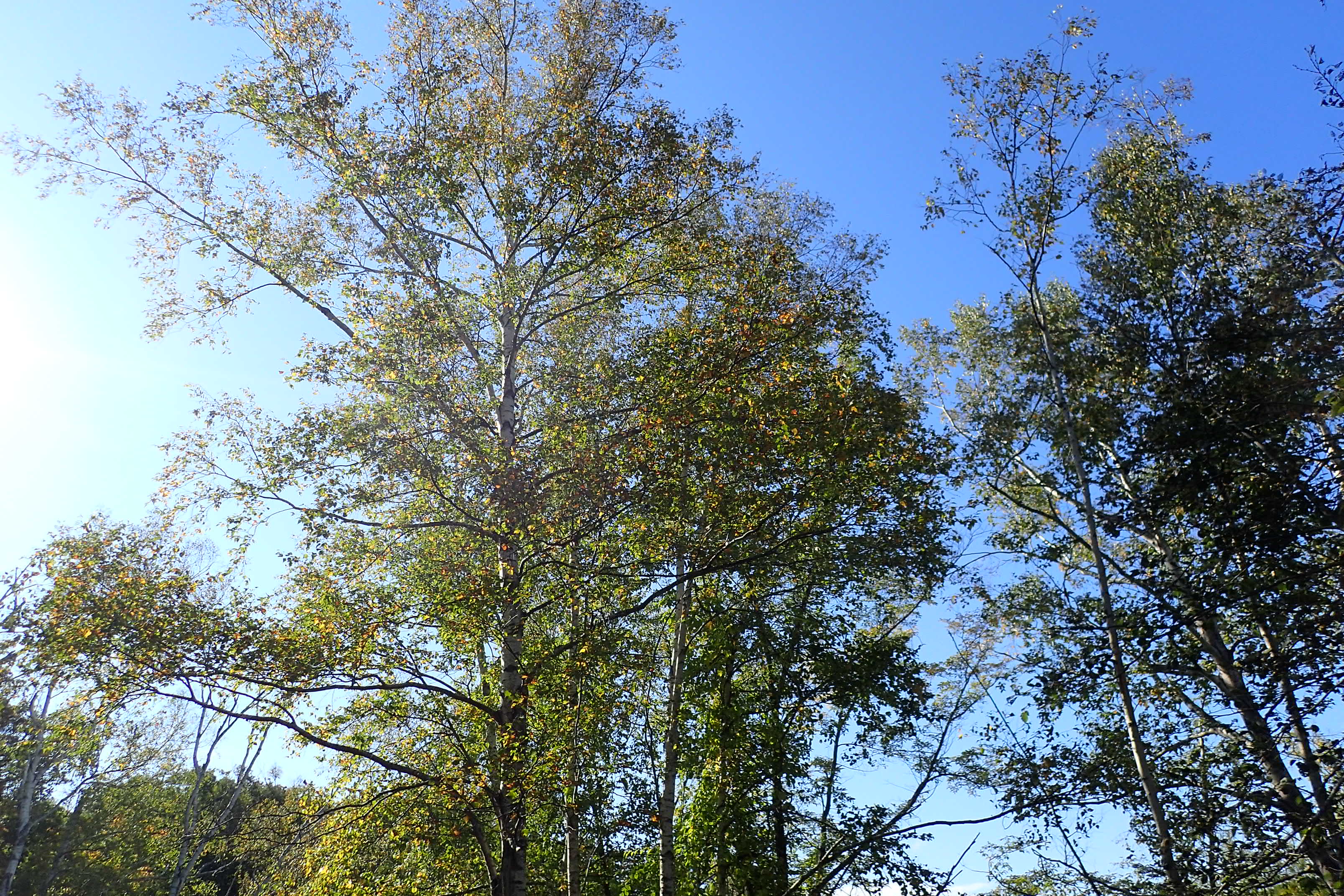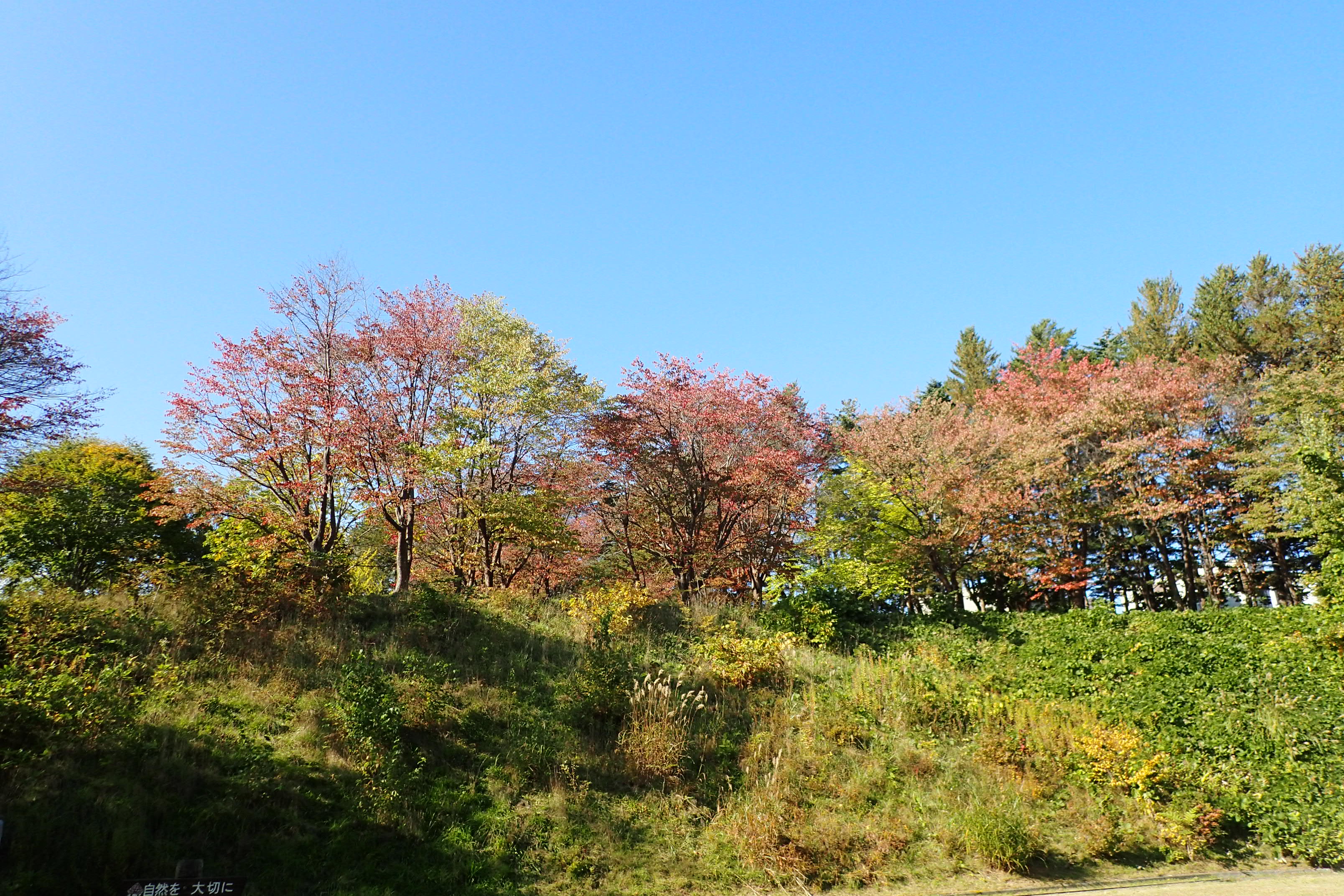 駐車場から見上げたら赤く紅葉したエゾヤマザクラが見えました。