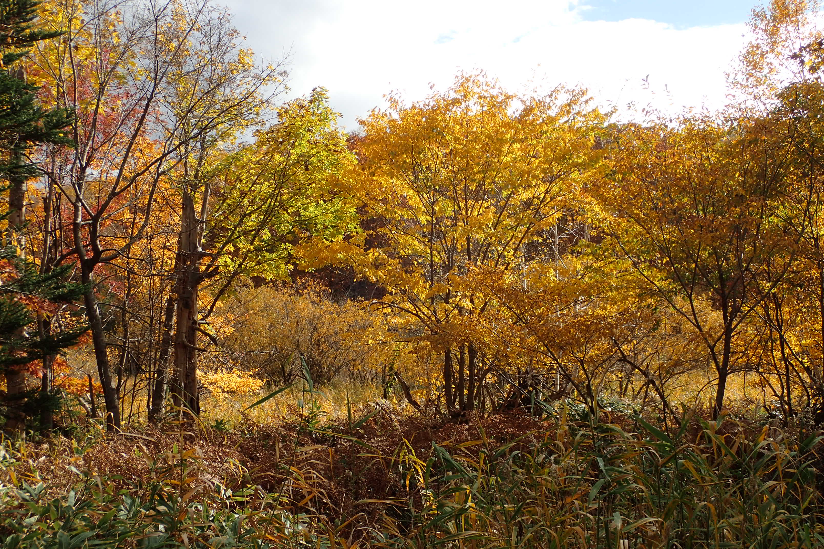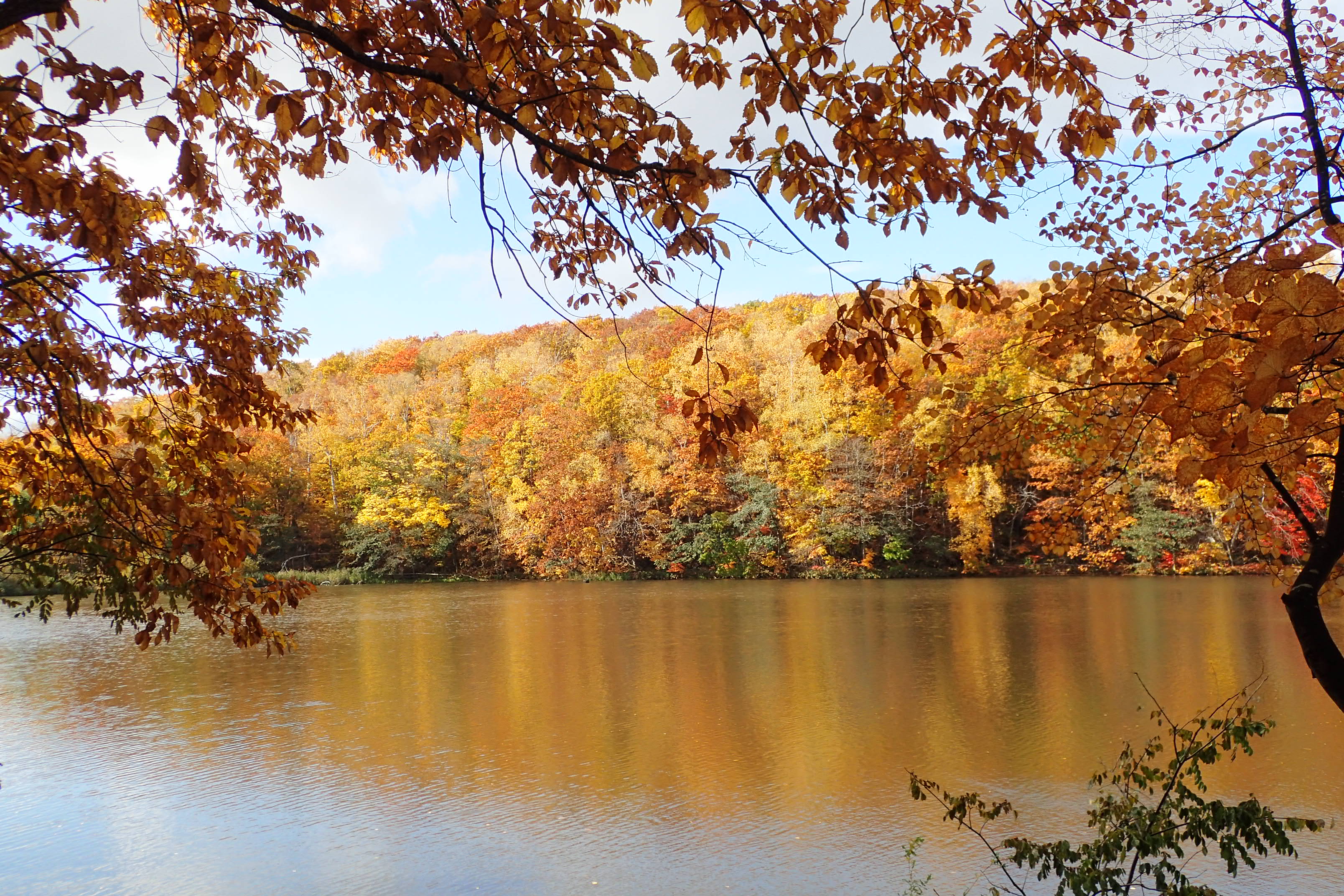 10月25日の西岡公園は、森が紅葉で色付いて綺麗です。落ち葉が風にくるくる舞っています。