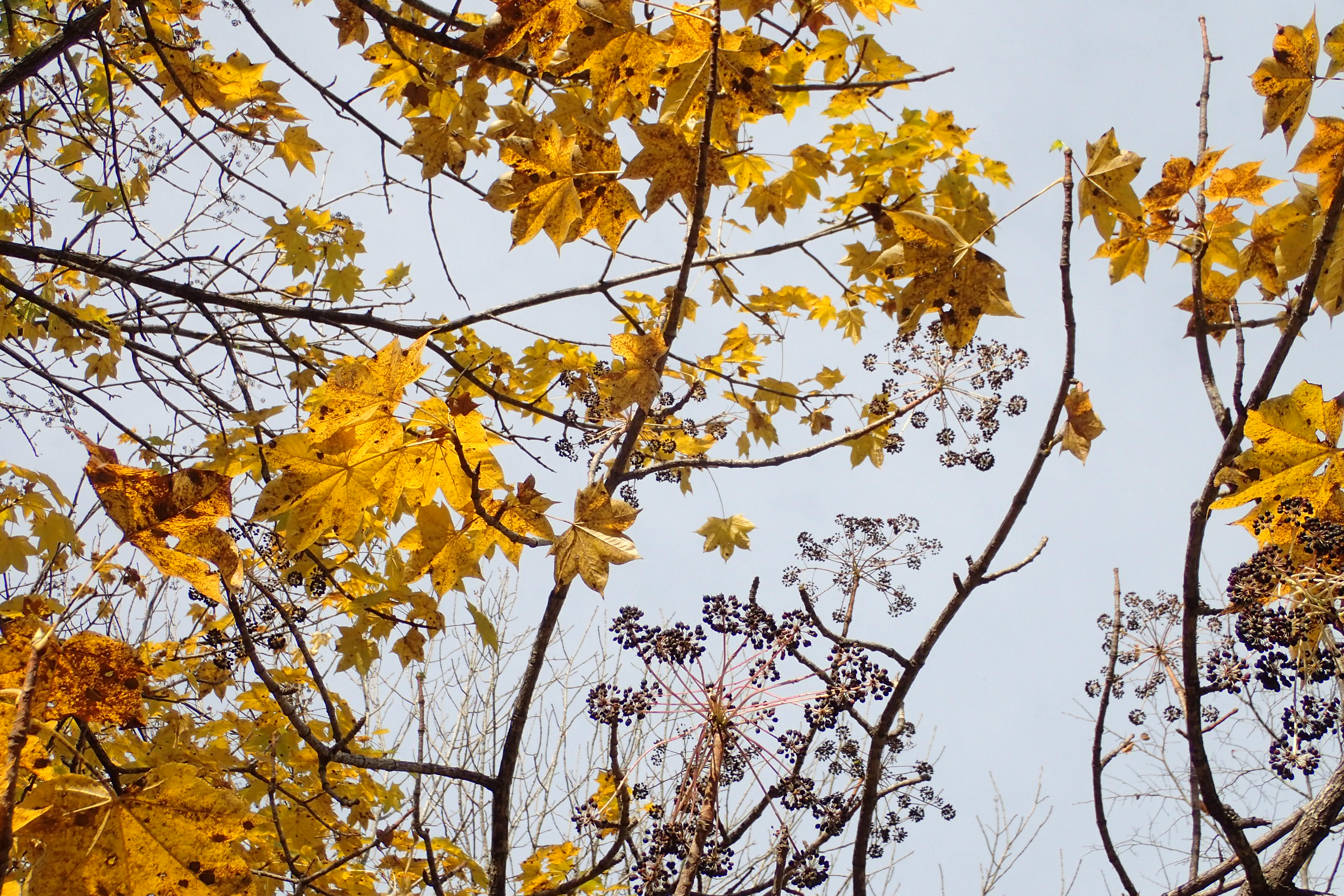 ハリギリの葉は手のひらサイズから人の顔よりも大きいものもあります。レモン色の葉が綺麗ですが、落葉するとわりとすぐに茶色くなっていきます。