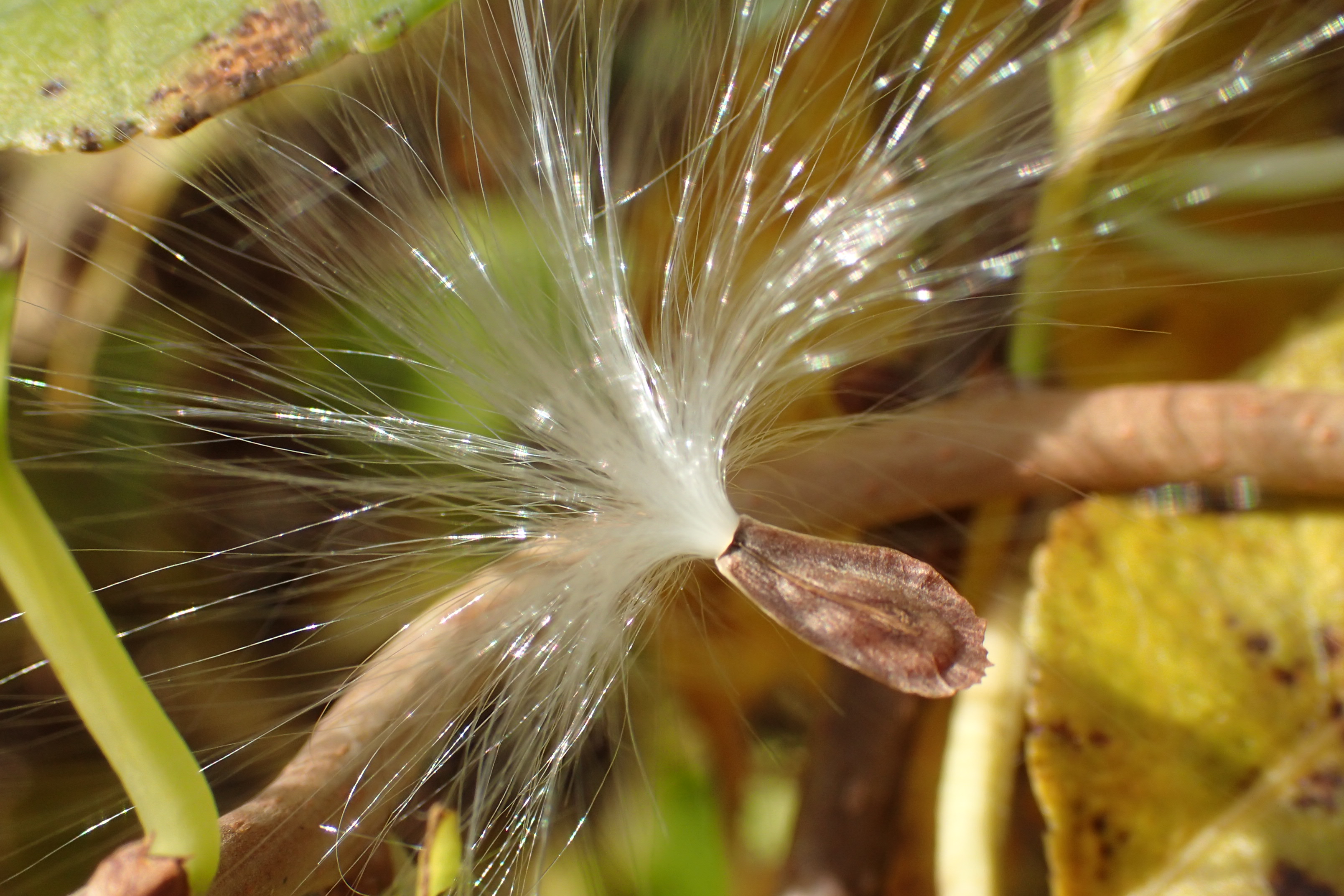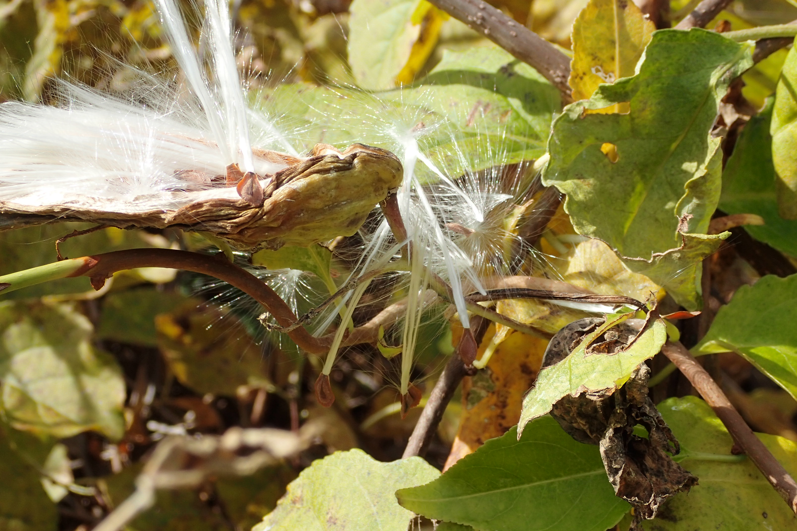ガガイモの実が割れて中の種が風に飛んでいました。直径3センチ近くもある大きな冠毛です。