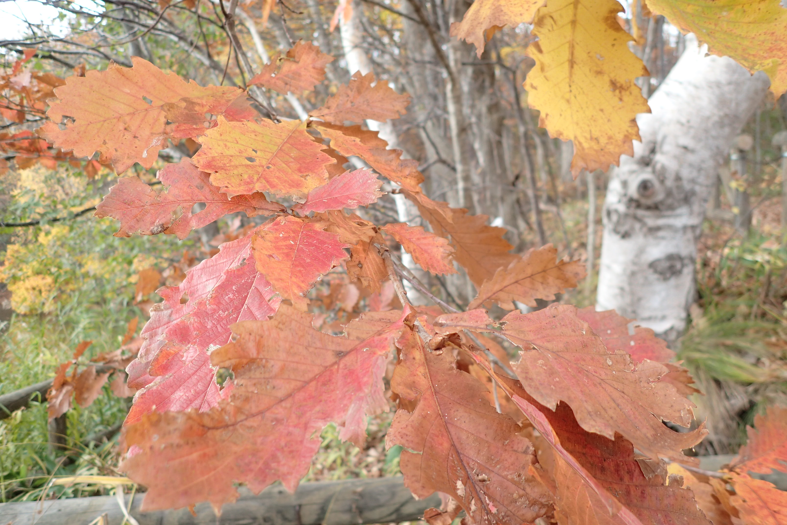 ミズナラの葉。茶色の落ち葉がほとんどですが、いろいろな色の紅葉を見つけましたよ。黄色やオレンジ、ボルドー、等々の色を見ることが出来ました。