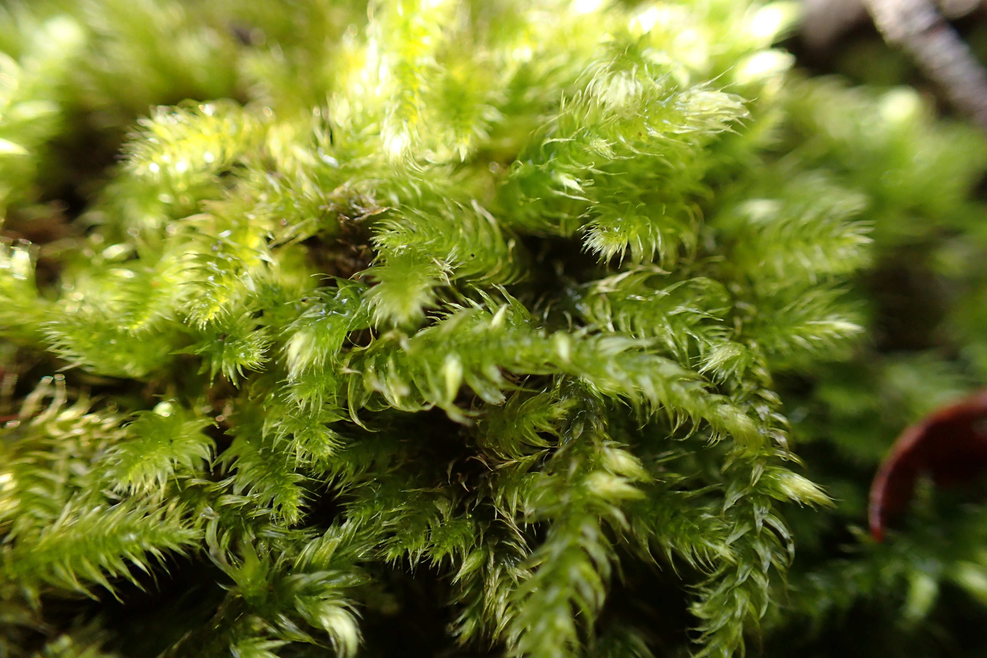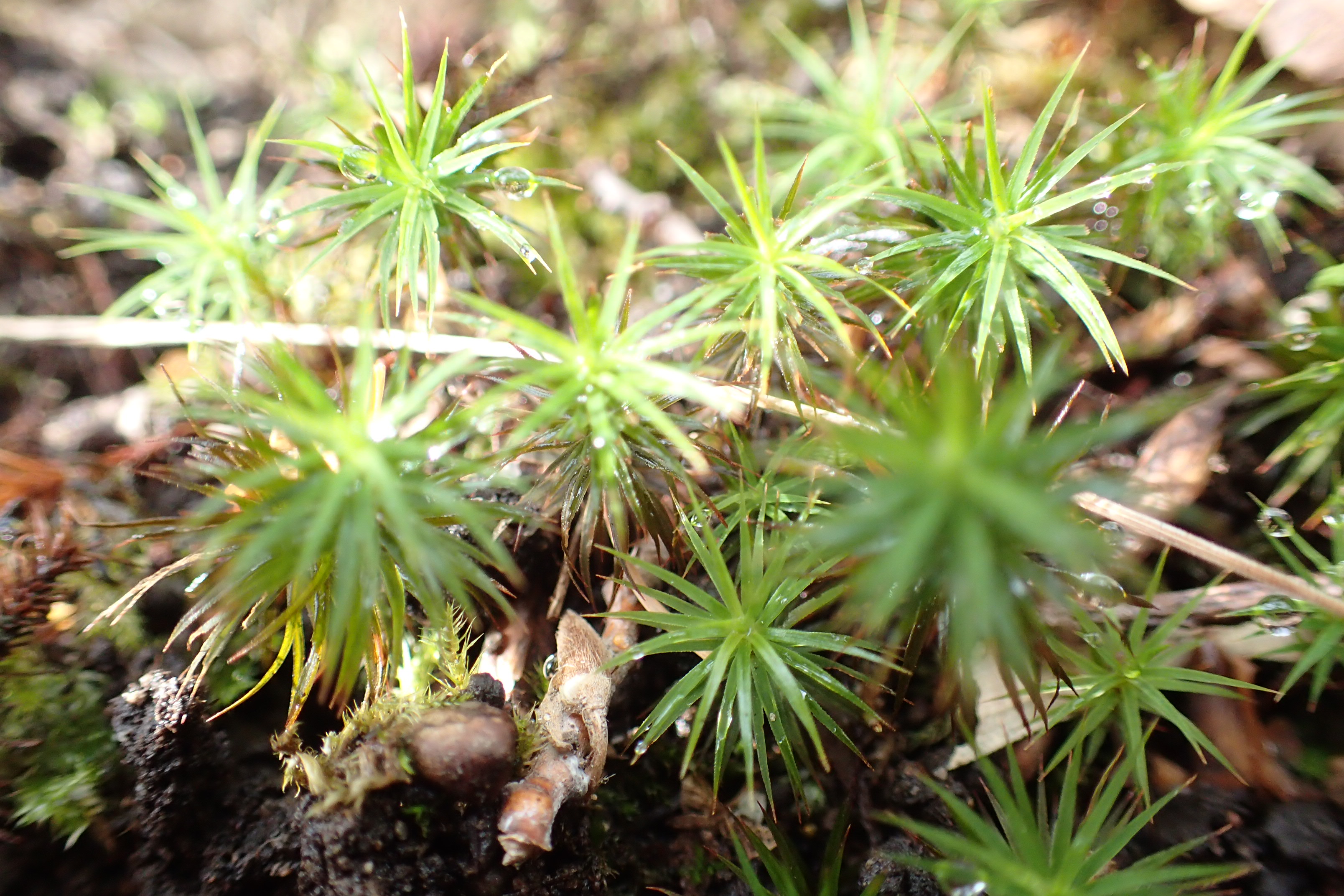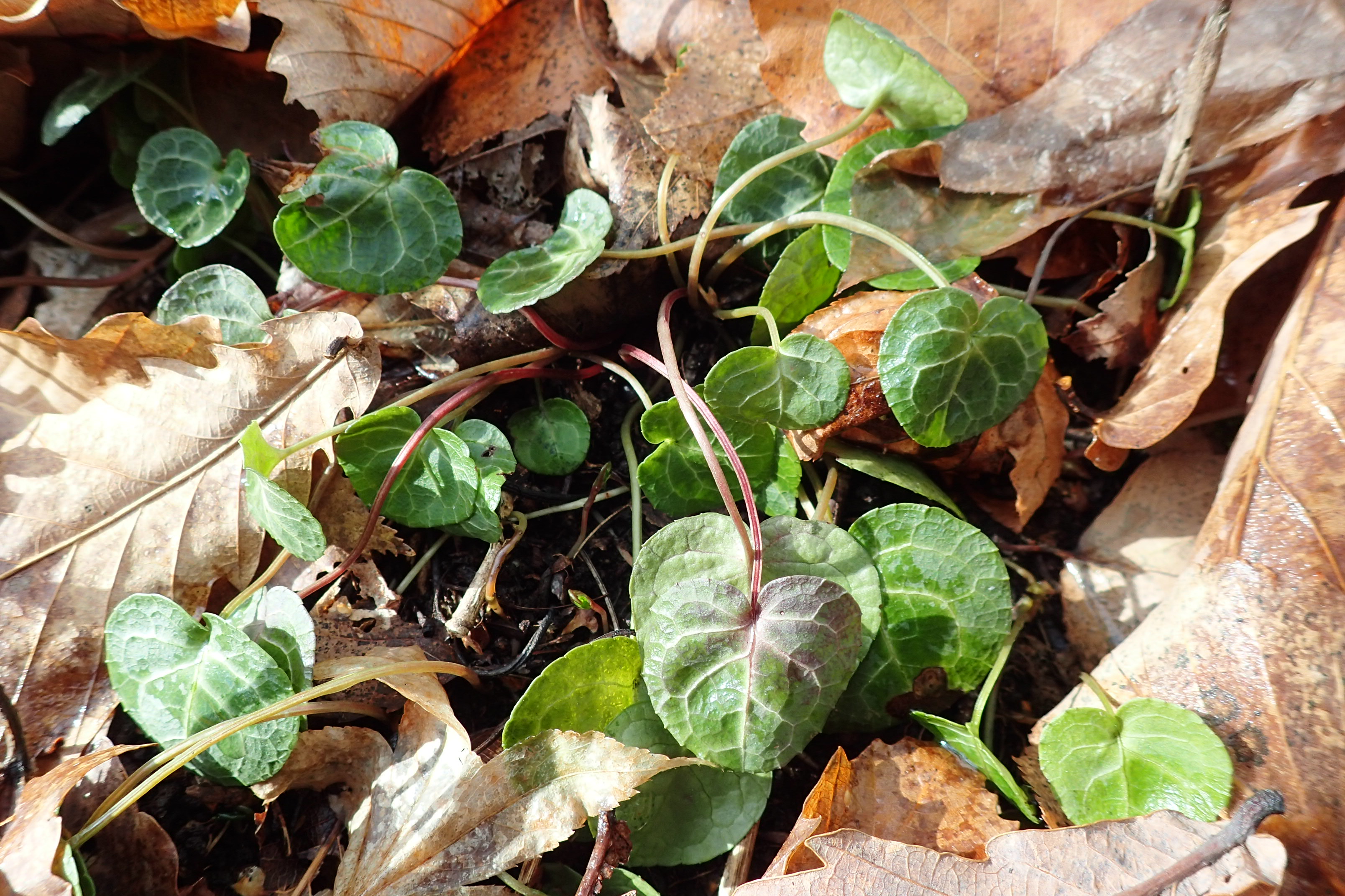 足元に目をやると枯れ葉のなかに常緑の植物の緑がみずみずしいですね。苔の仲間やジンヨウイチヤクソウです。