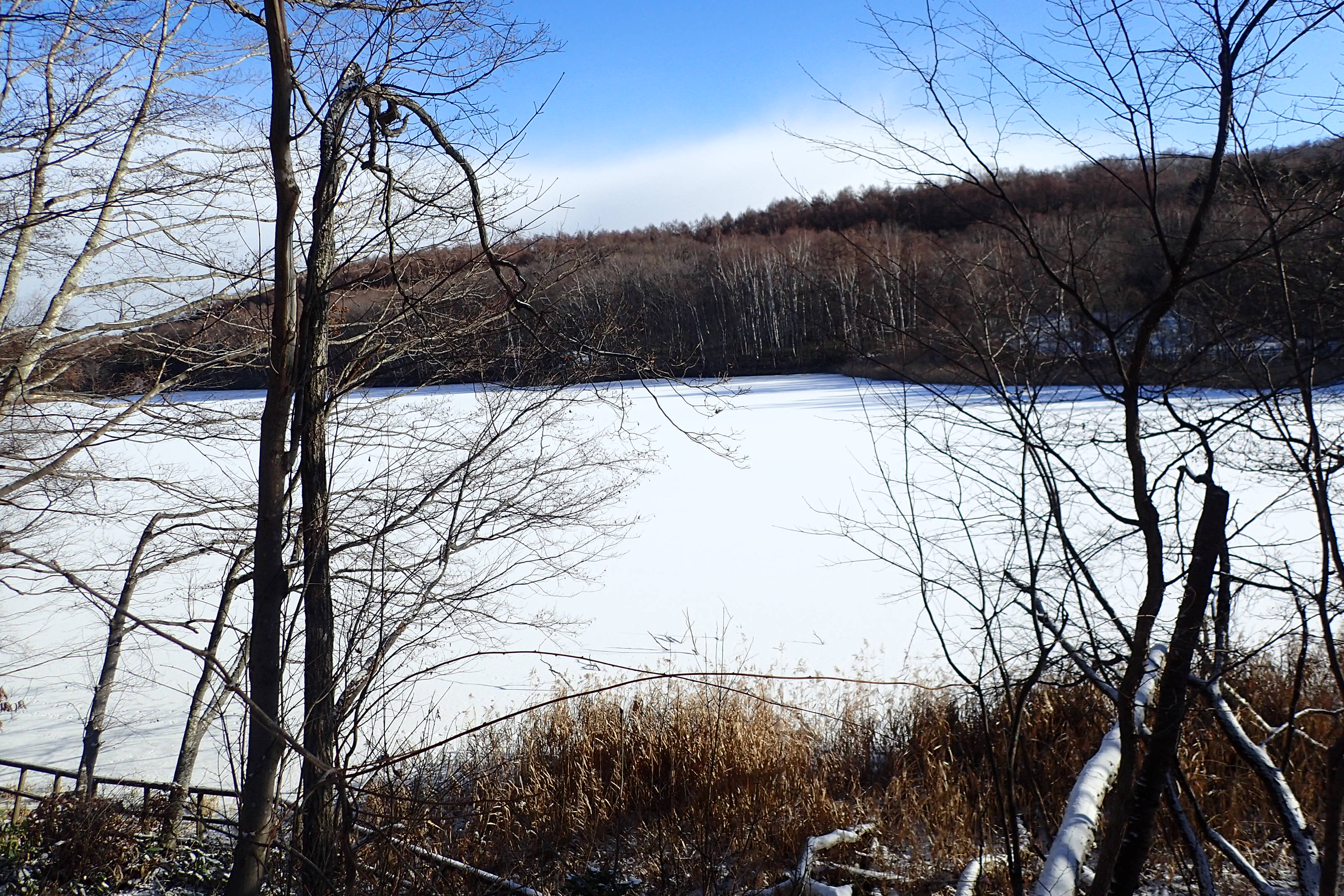 池はすっかり雪に覆われています。池から流れ出る川の始まる辺りには氷は張っておらずマガモのつがいがいましたよ。