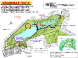 今年度も引き続き改修工事を実施するのに伴い、9月より公園内のご利用を一部制限させていただいている所ですが、2月12日より取水塔方面への通行が可能となりました。