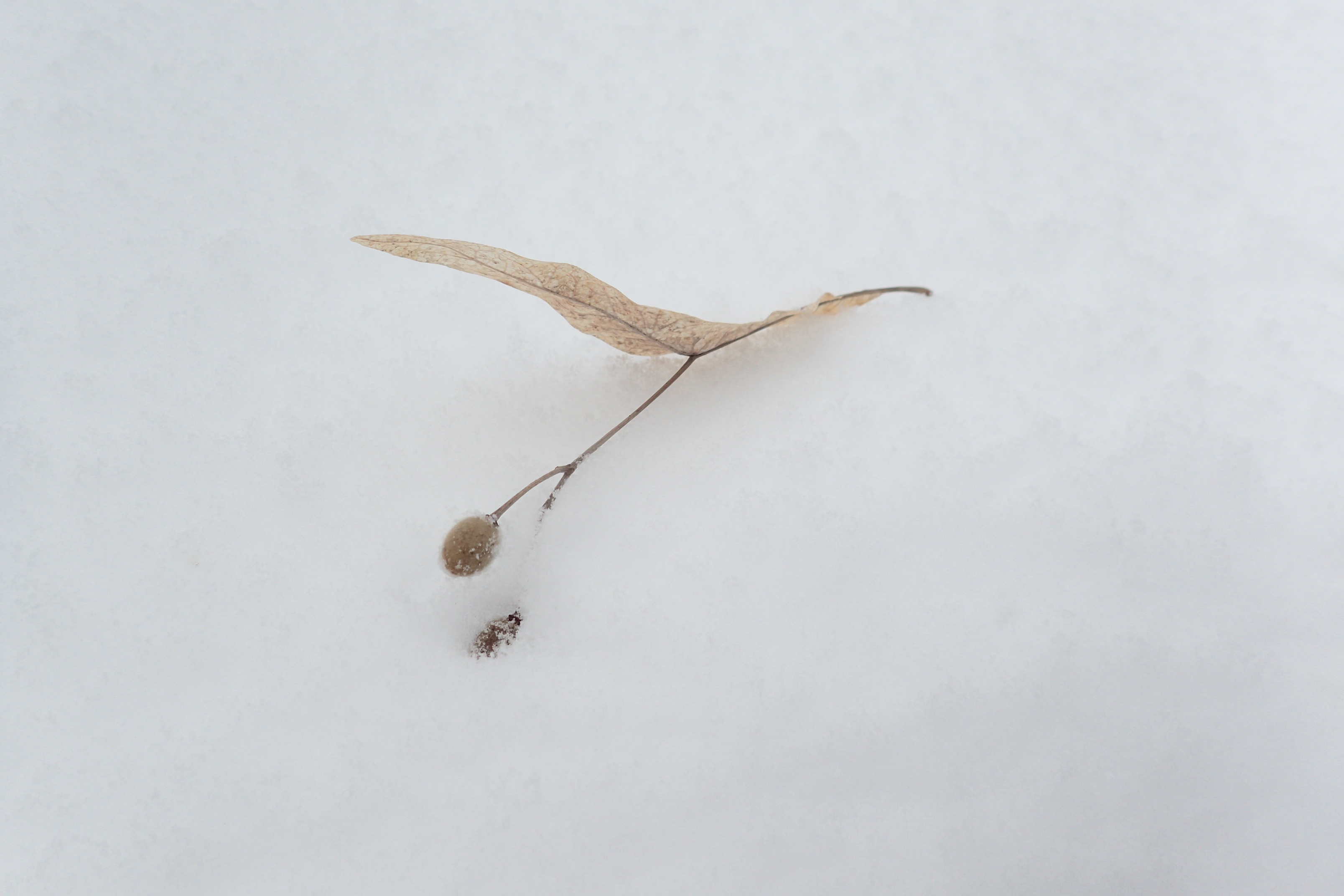 イワガラミ。長さ2~3センチの一枚のがく片がついています。つる性の木で他の木に絡みつきます。見上げると枯れた花がまだ木に付いているのが分かります。今日は雪の上にあるのを見つけることが出来ました。