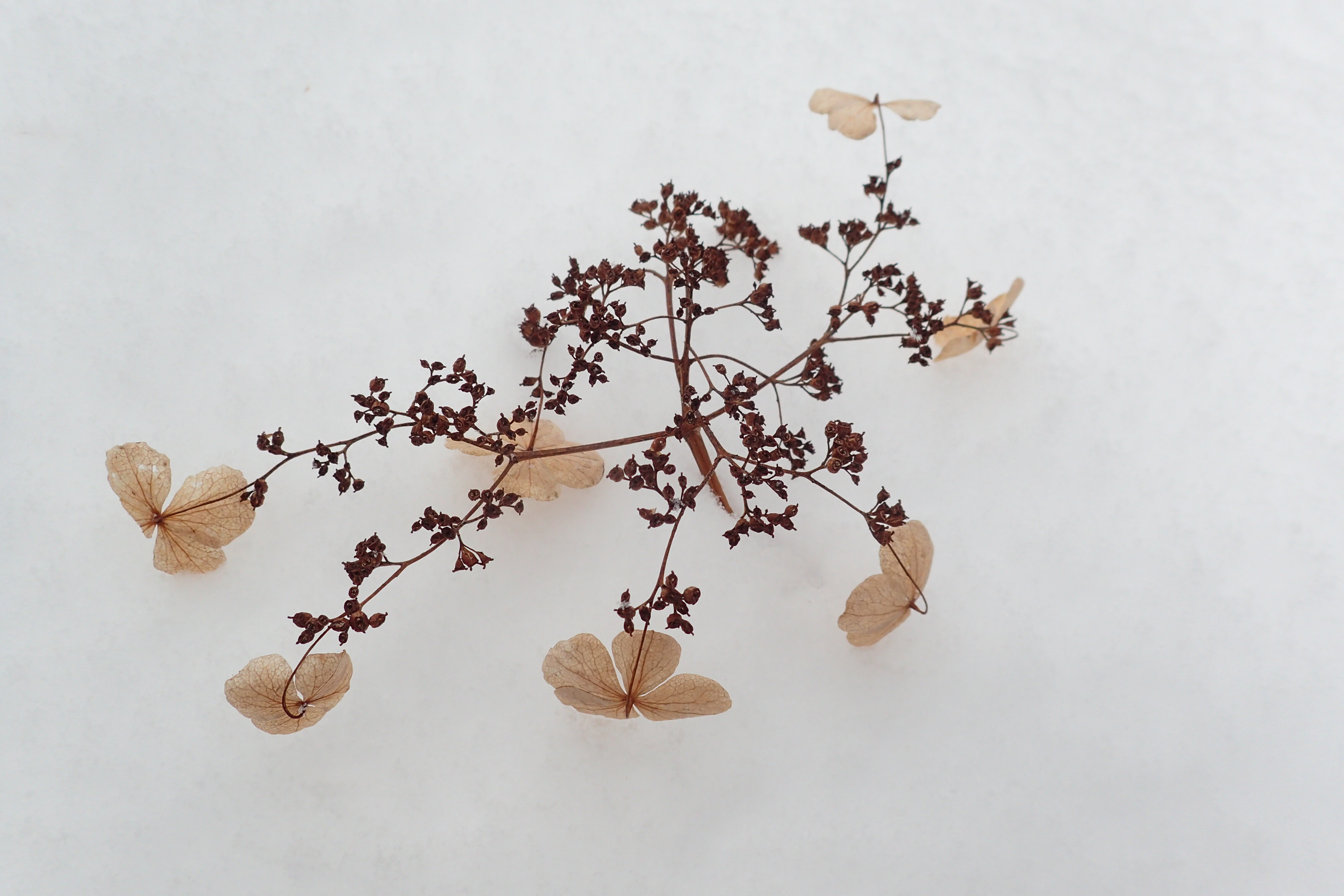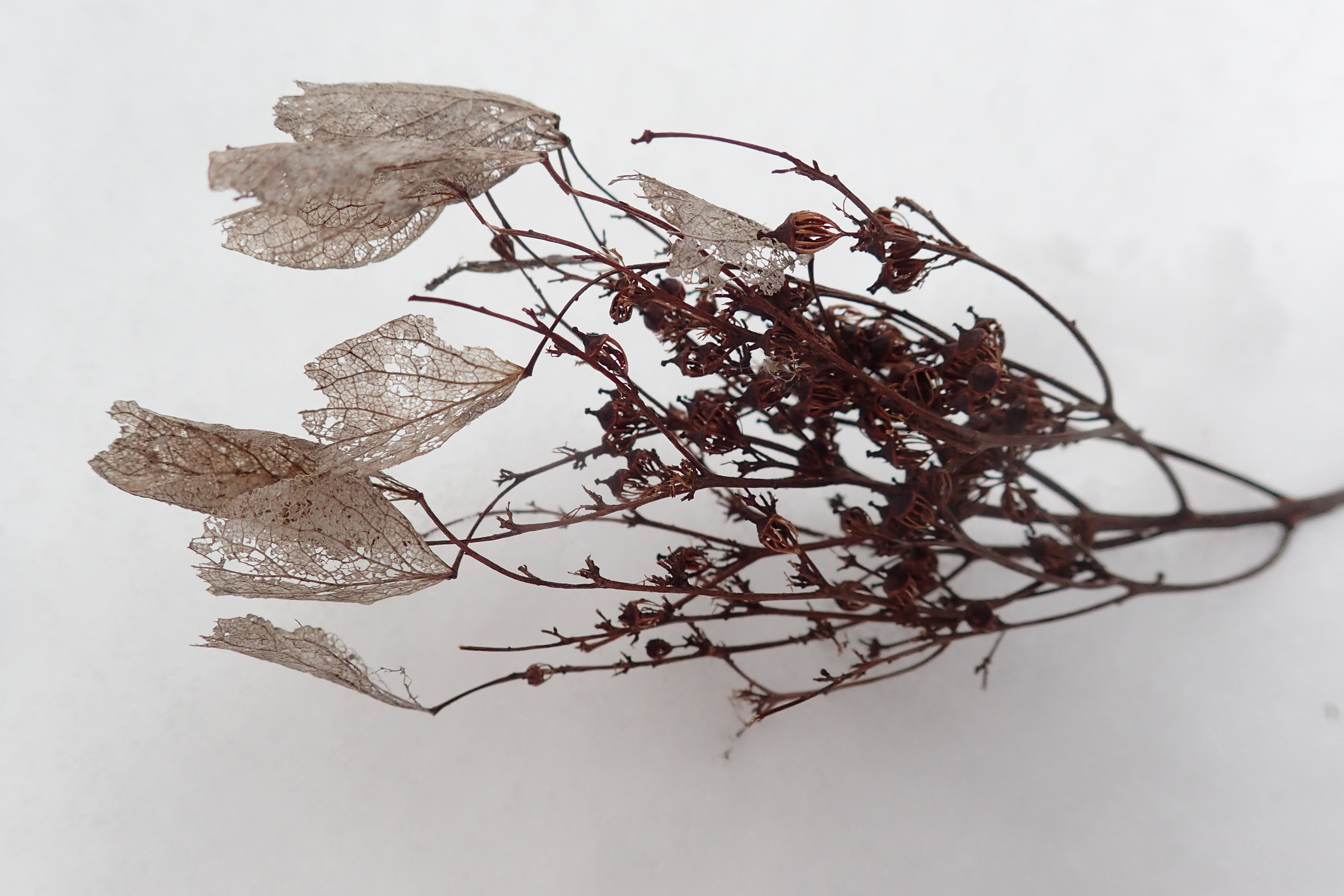 ツルアジサイ。つる性の木で他の木などに登ります。よく、雪の上に転がっているのを見かけます。木に付いたままのものもまだあります。がく片は3~4枚です。
