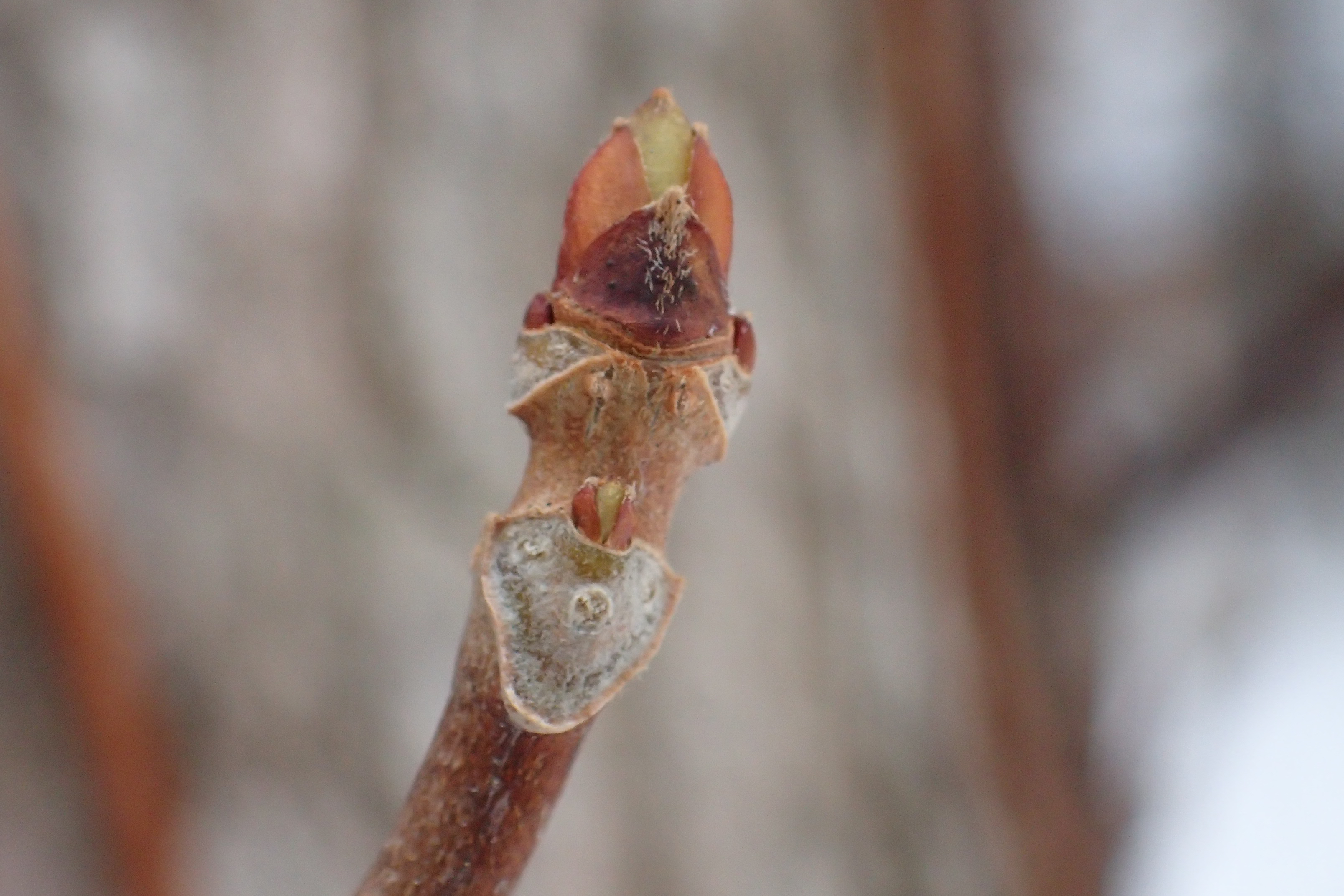 イワガラミの冬芽です。もう緑色がのぞいていますね。