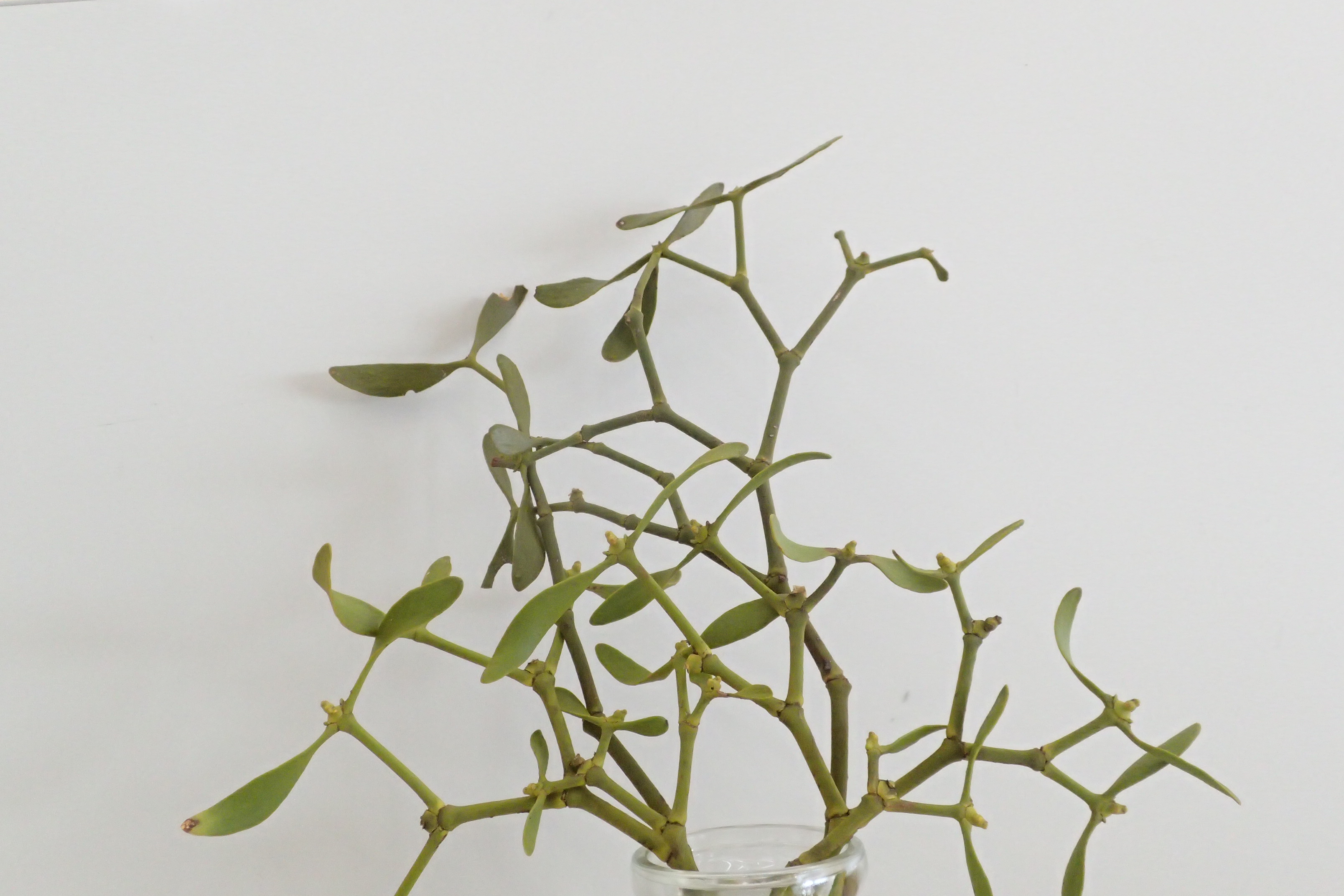 高い所にあるので近くで見る機会はなかなかないのですが、ヤドリギの小枝を拾ったのでガラス瓶に活けて管理事務所に展示しています。