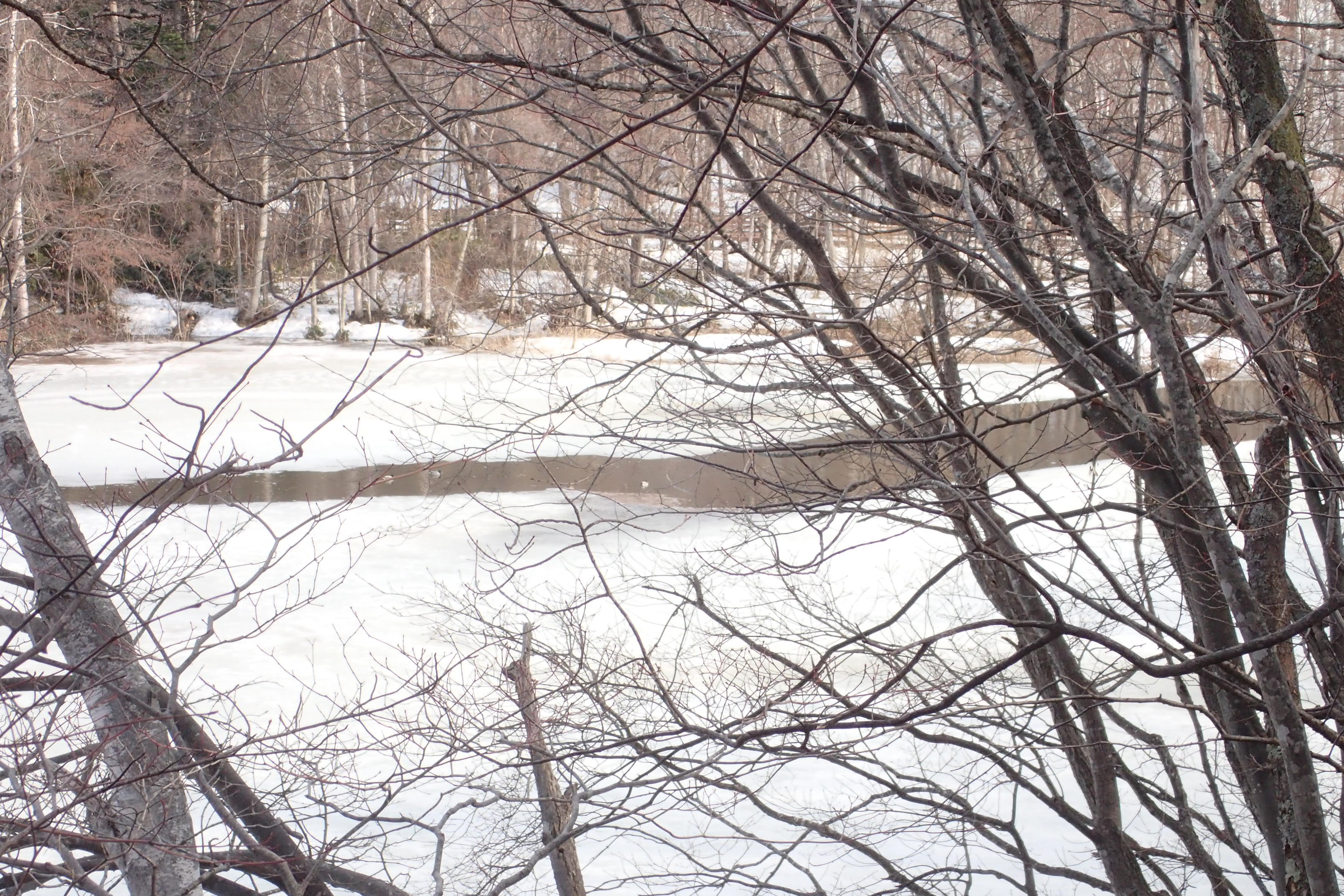 湿原から池に水が流れ込む辺りは氷が解けています。