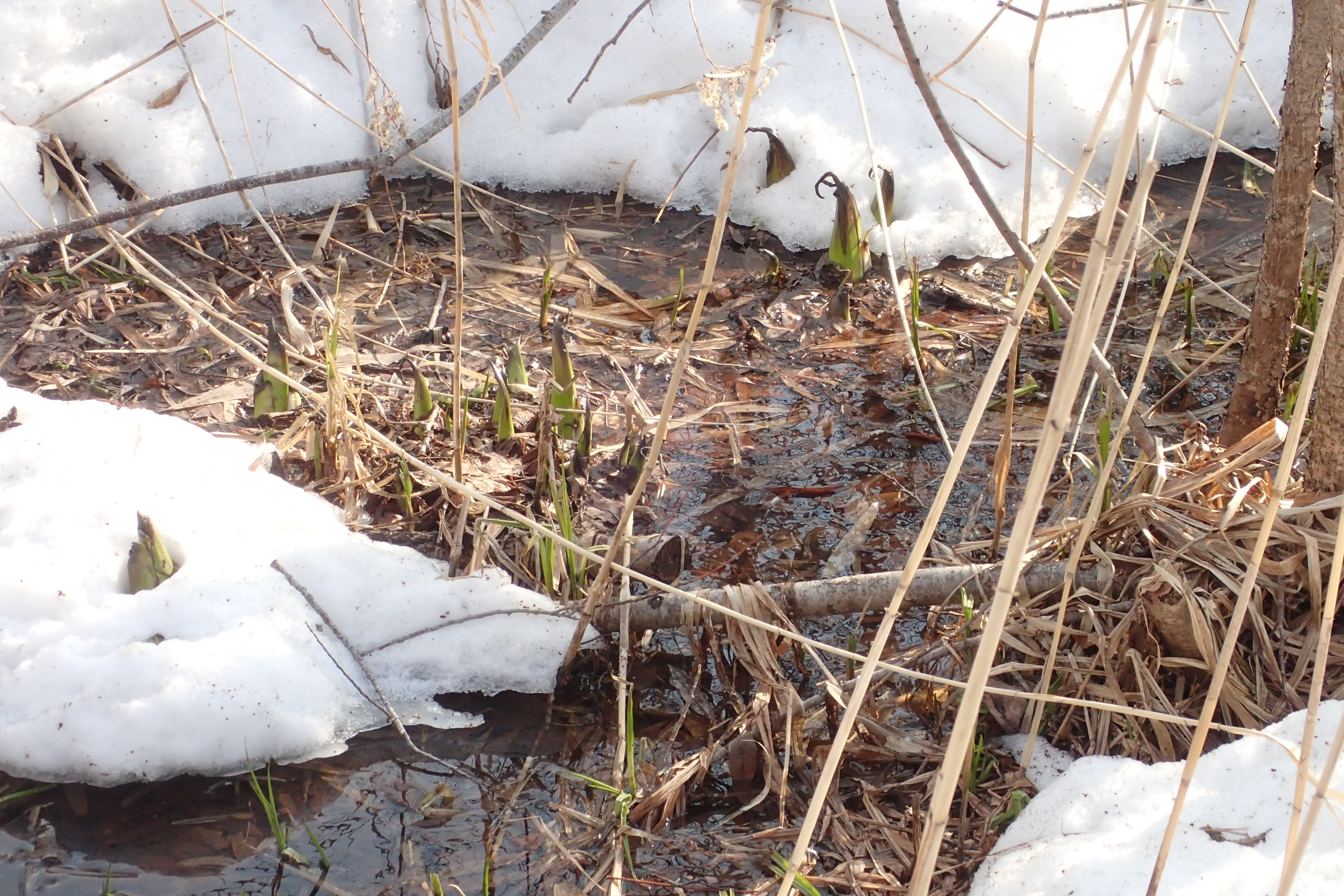 久しぶりに歩く園路にはクマゲラの食痕の大きな穴があったり、ミズバショウの芽がのぞいていたり、発見がたくさんでしたよ。