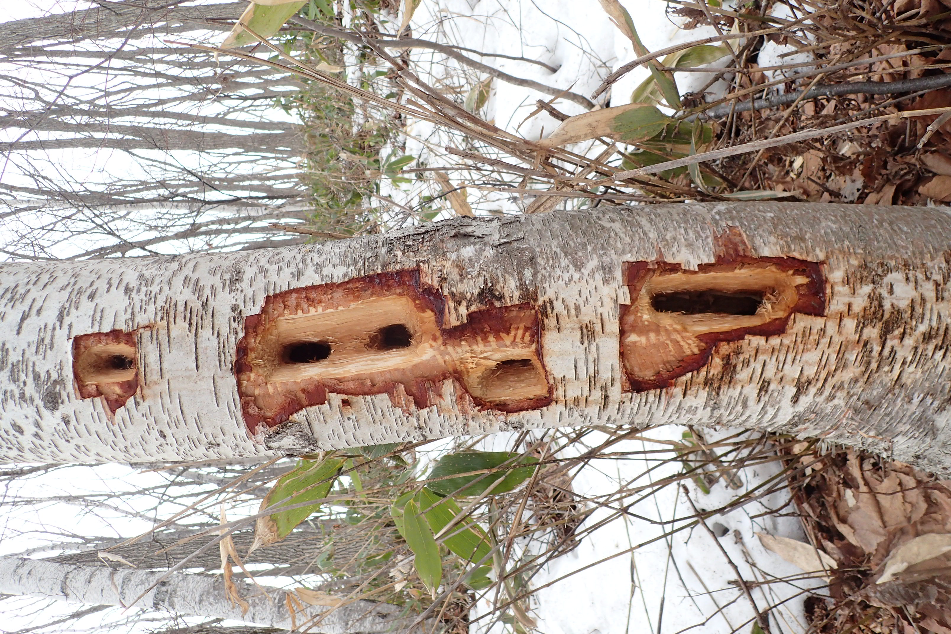 クマゲラの食痕。大きく穴をあけましたね。木の中にいるアリなどを食べた痕です。