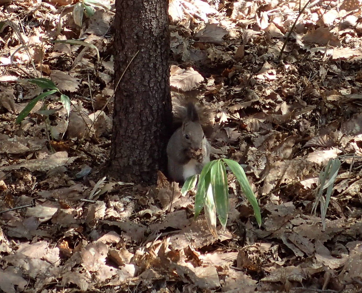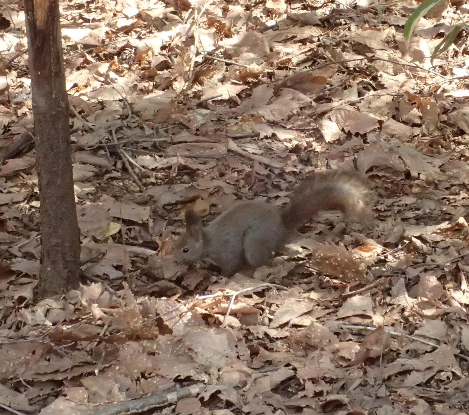エゾリスが落ち葉をほって何かを見つけました。