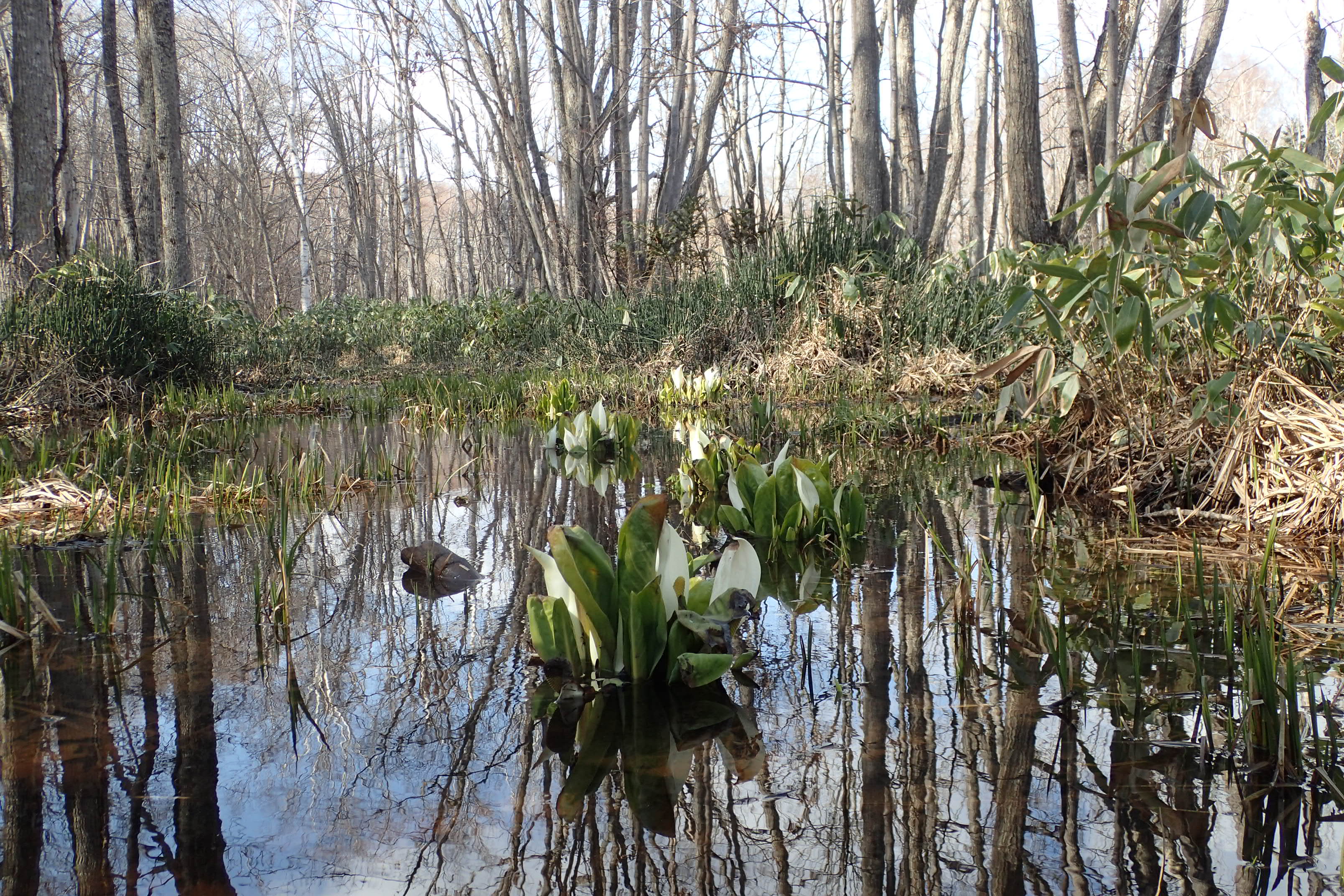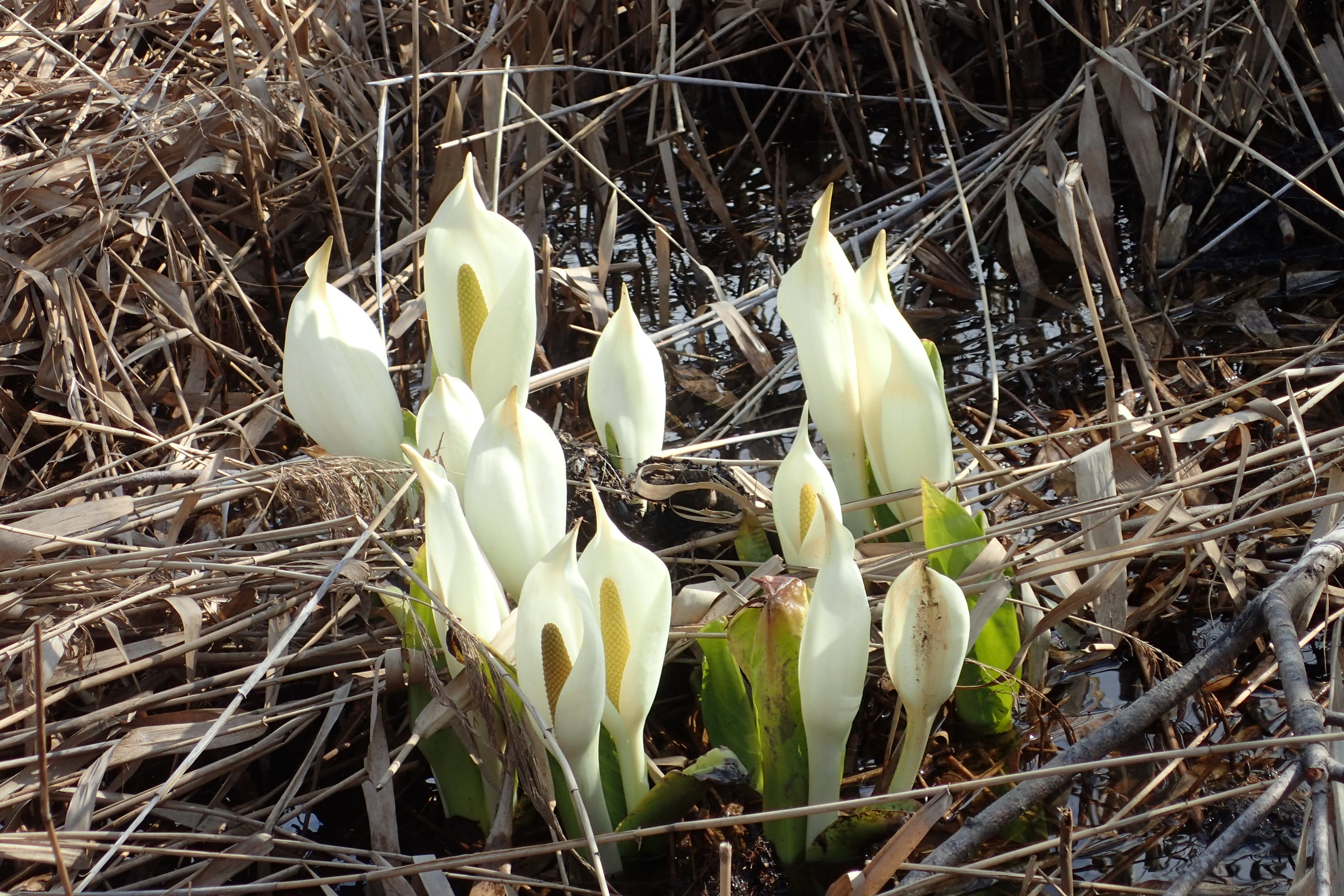 ミズバショウが綺麗に咲き始めています。こんな可憐な姿を見られるのもほんのわずかの期間です。6月には葉が大きく茂り高さが1メートルを越えます。