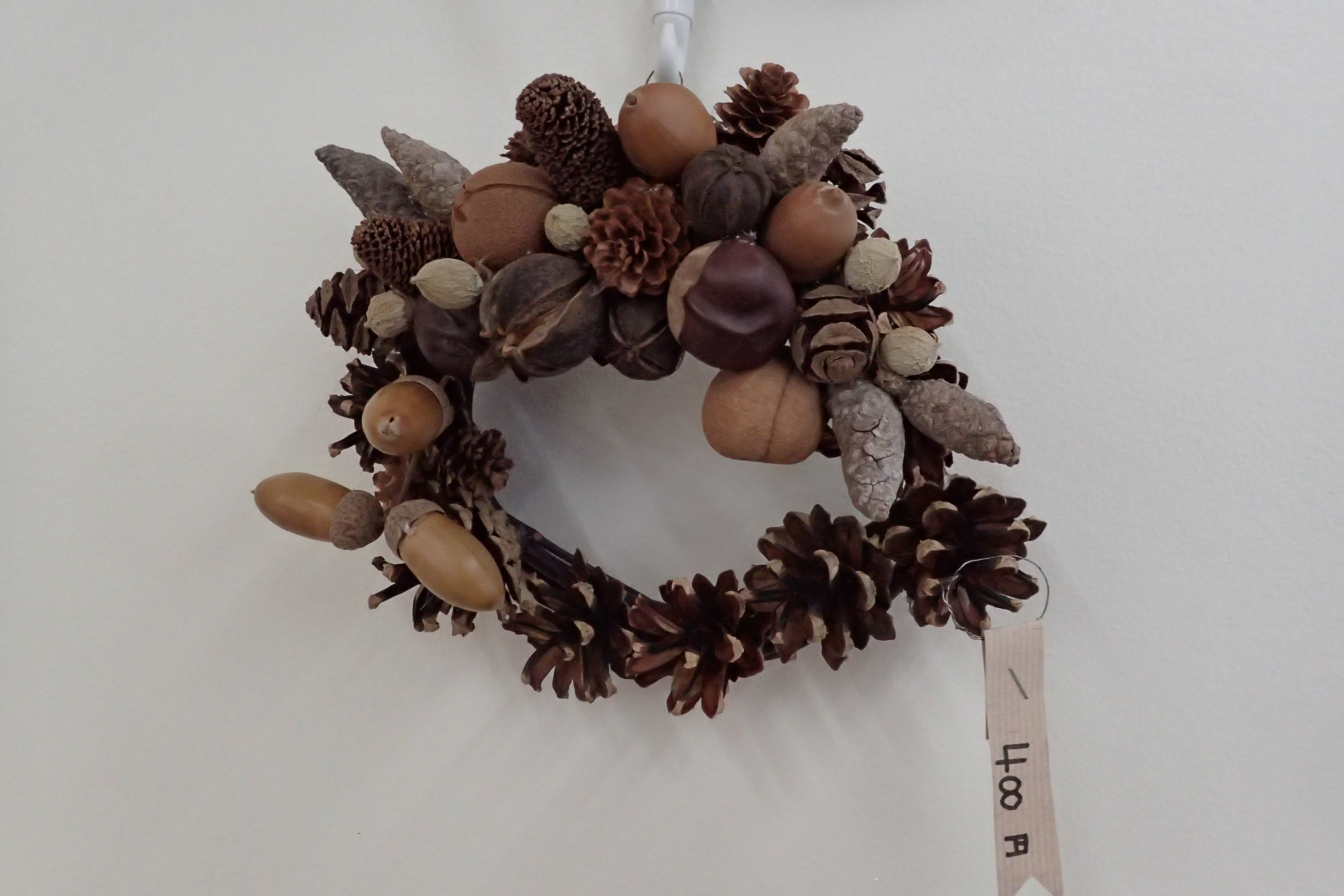 木の実などがぎっしり詰まったボール状のリース。全方位から見られて素敵です。