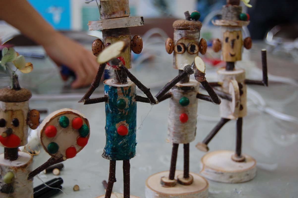 今回は、準備してくれたパーツを組み合わせて、自由に人形を作りました。 楽器を弾く人、歌を歌う人から、マンモス、犬などの動物まで、個性豊かな作品がたくさん できあがりましたよ。