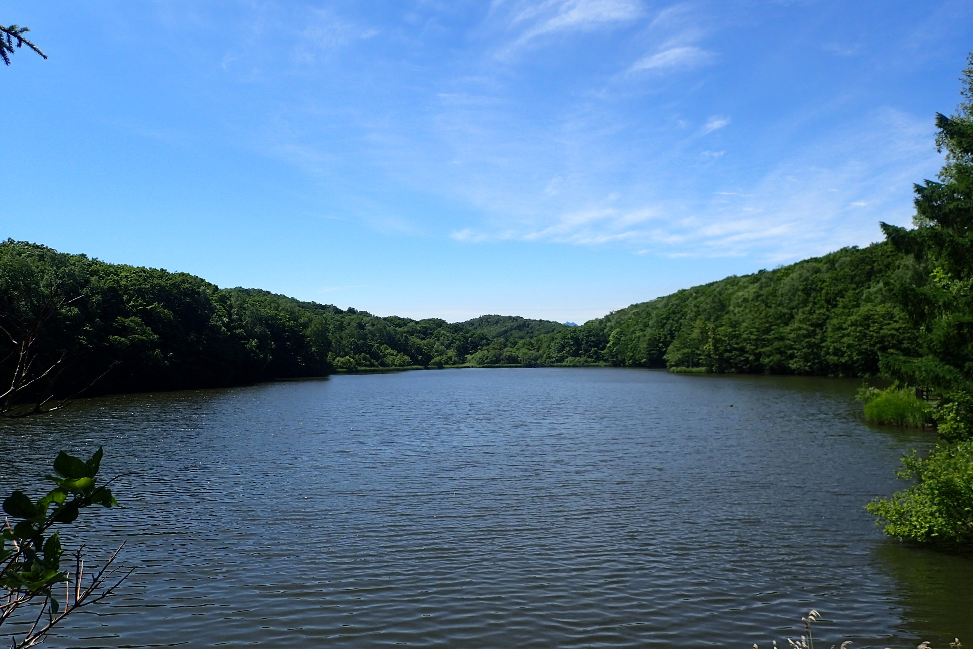 青空が広がる西岡公園の池の向こうには恵庭岳が見えています。