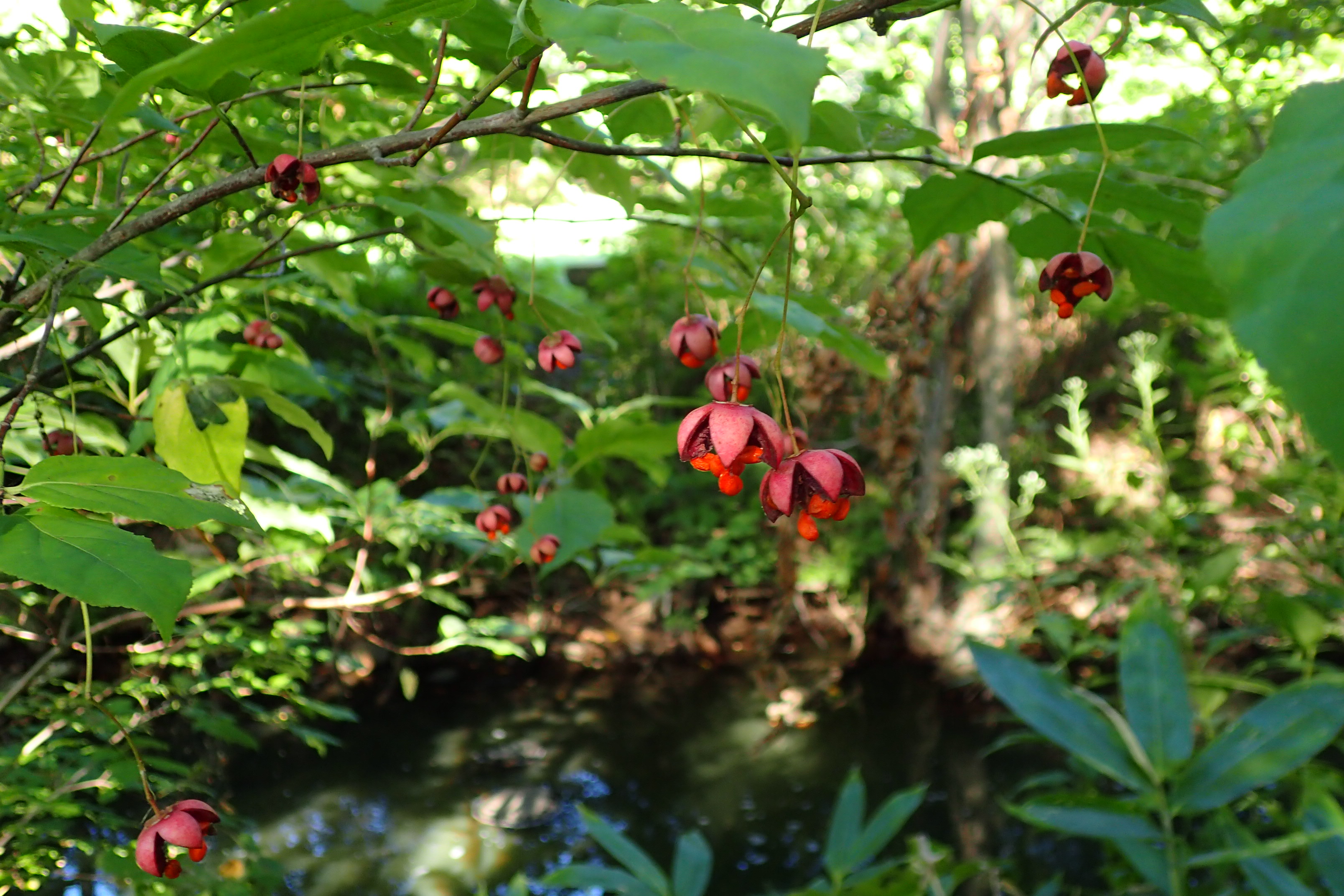 ツリバナの果実が駐車場からすぐの川沿いなどで見られます。5つに割れて中から赤い皮に包まれた種子が出てきています。