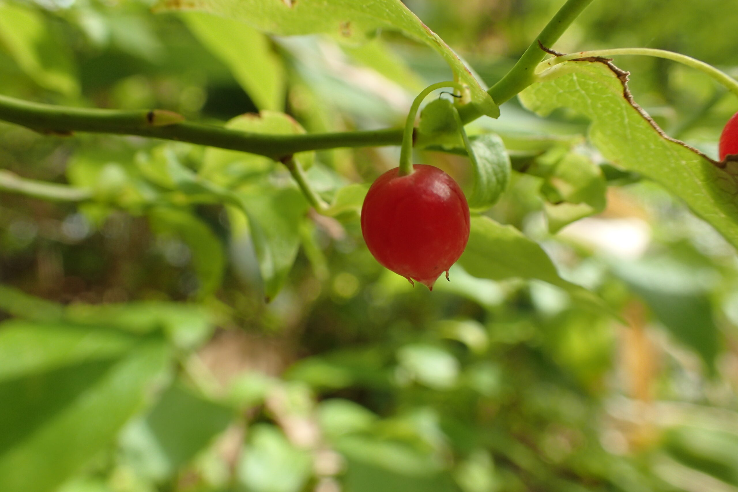 真っ赤でつやつやの5~6ミリの果実はアクシバのものです。アクシバは高さ50センチから100センチほどのツツジ科の樹木です。
