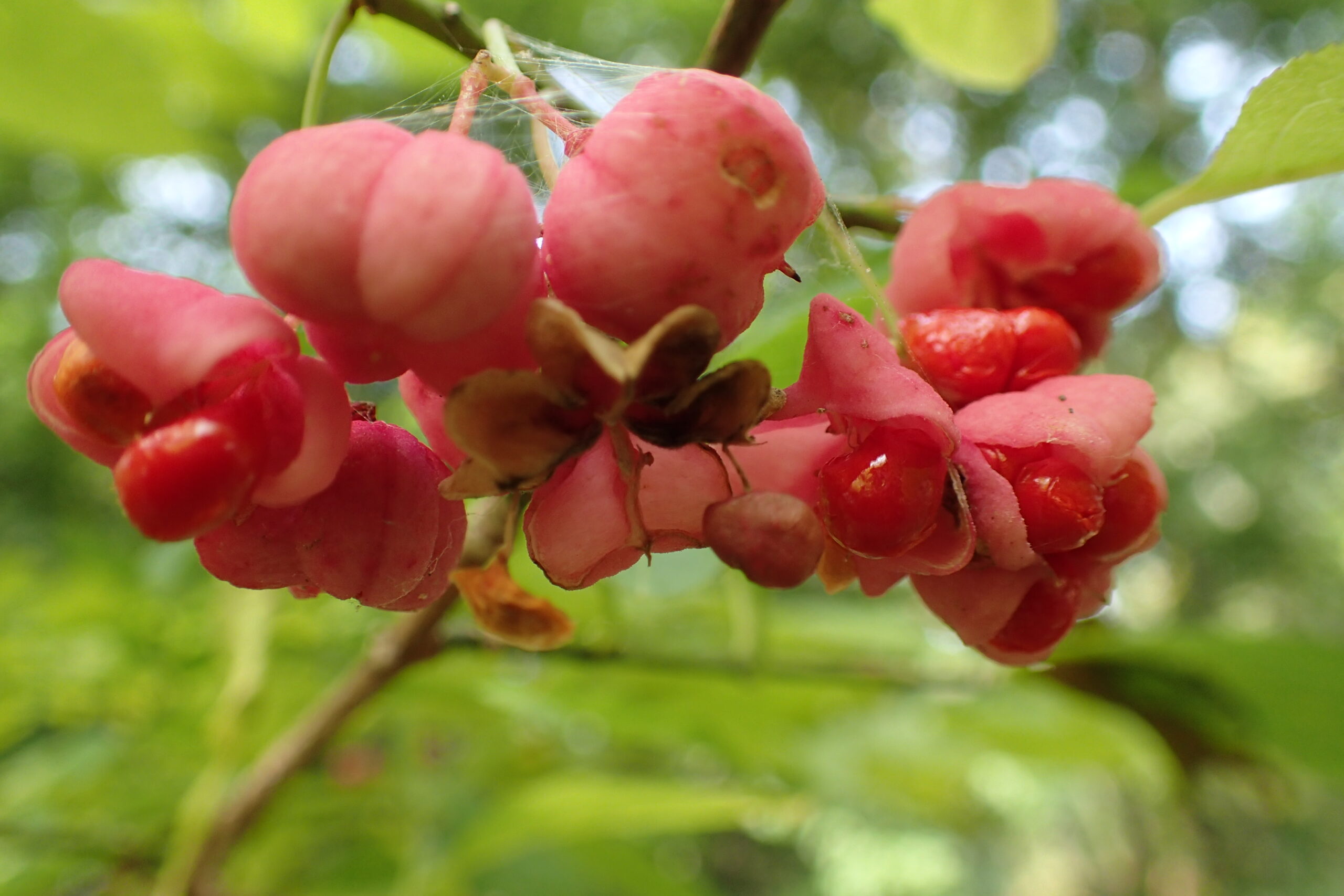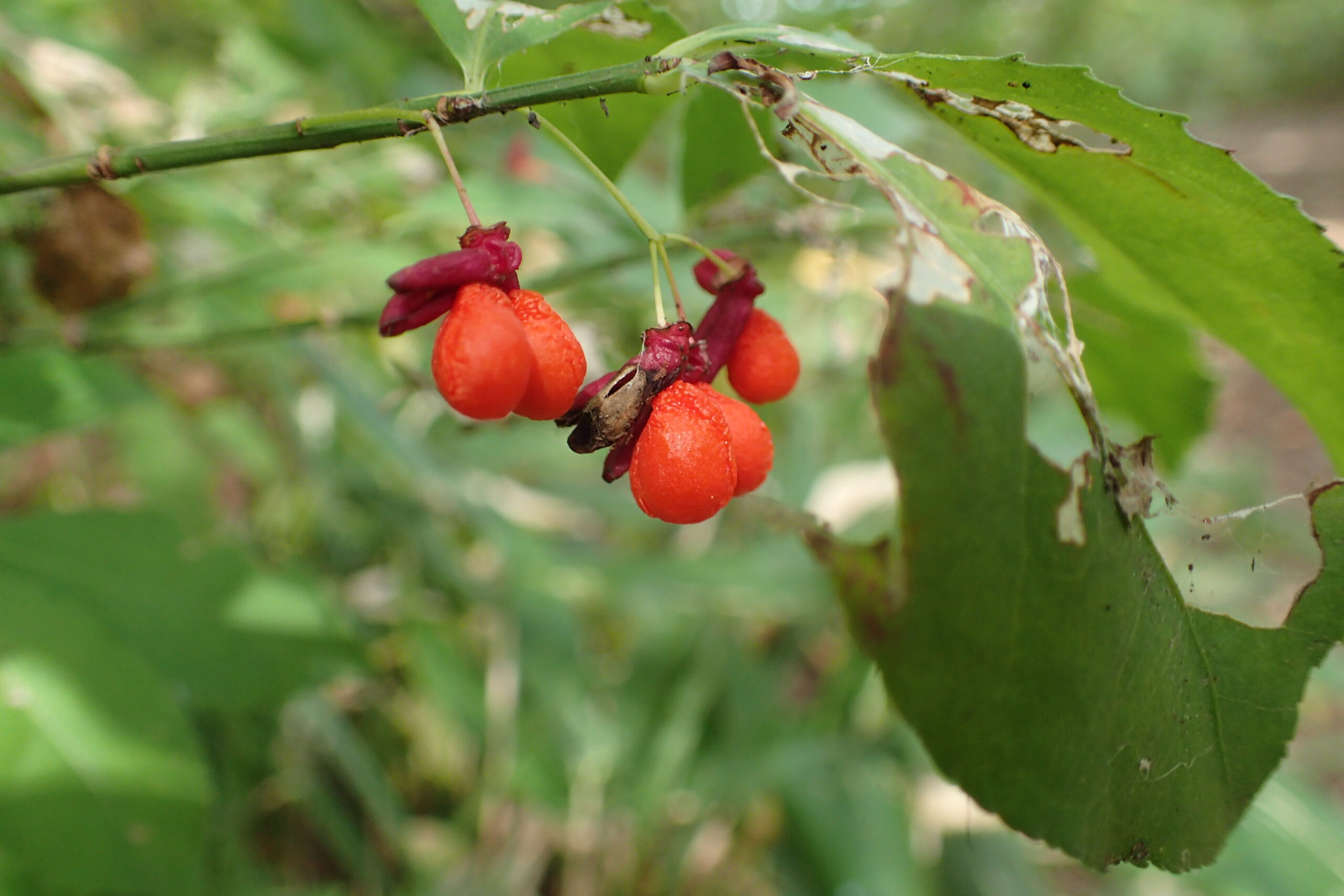 ツリバナの淡い色の紅葉と5つに割れた果実もありましたよ。
