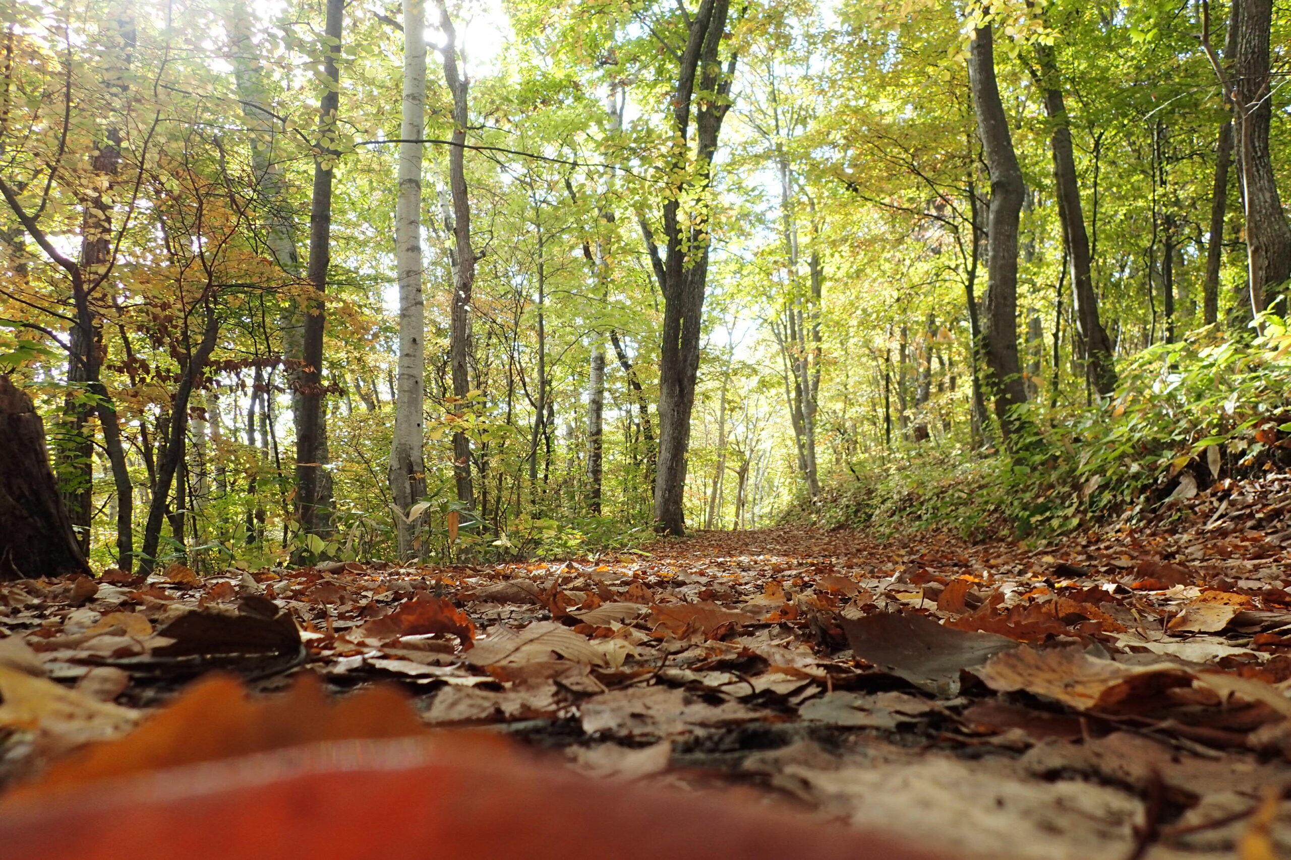 森の中の様子です。大きな葉のホオノキはあらかた落葉しています。