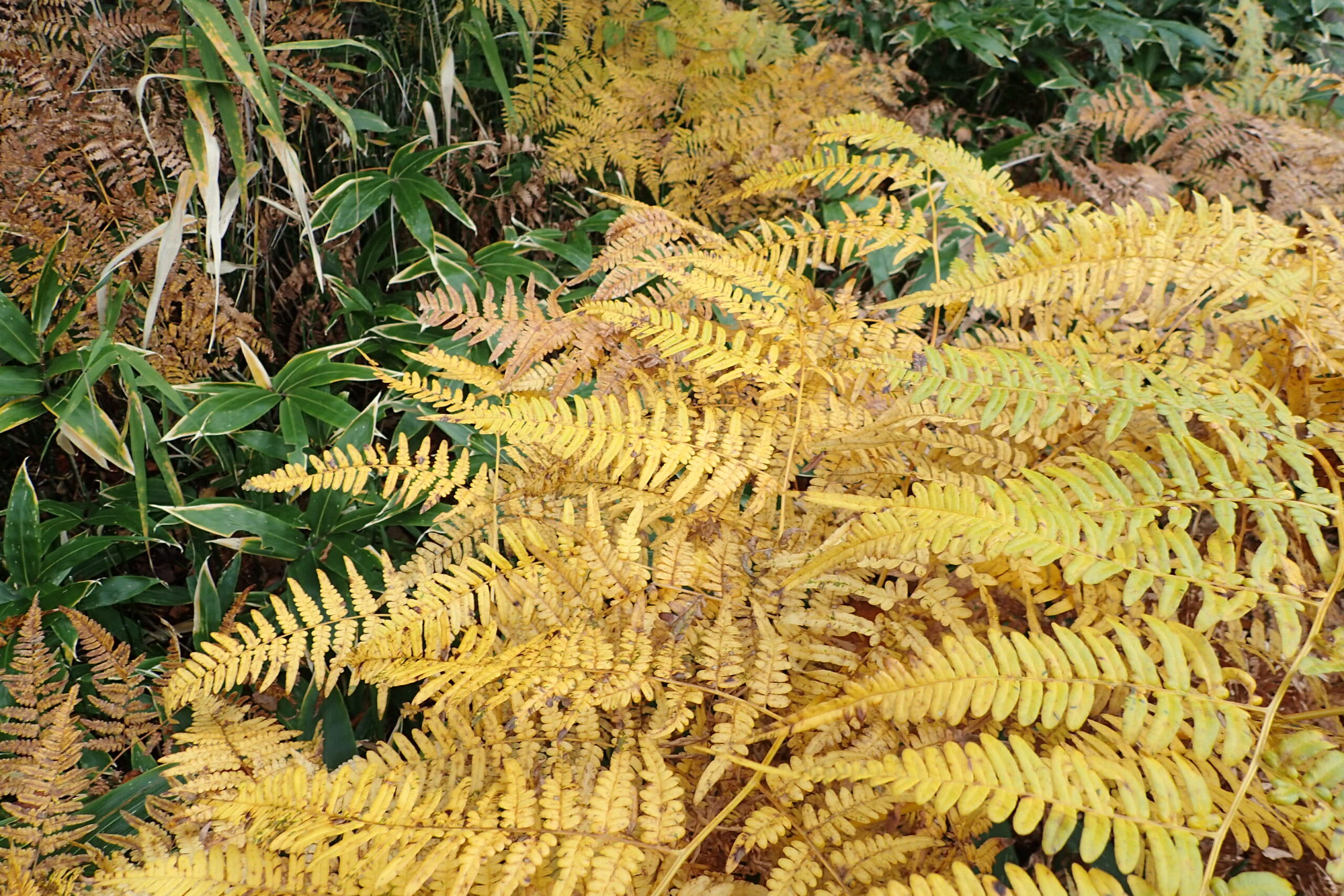 ワラビの草紅葉(くさもみじ)です。きれいに黄色く紅葉しています。この後褐色になって枯れていきます。