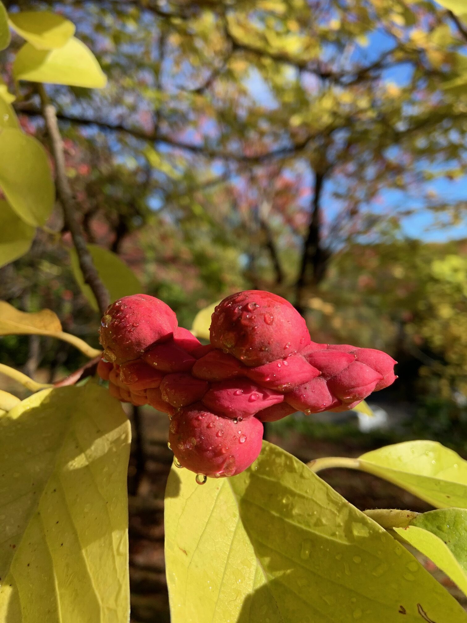 今朝は、水鏡になって森の紅葉と雲を移した池の姿を見ることが出来ました。