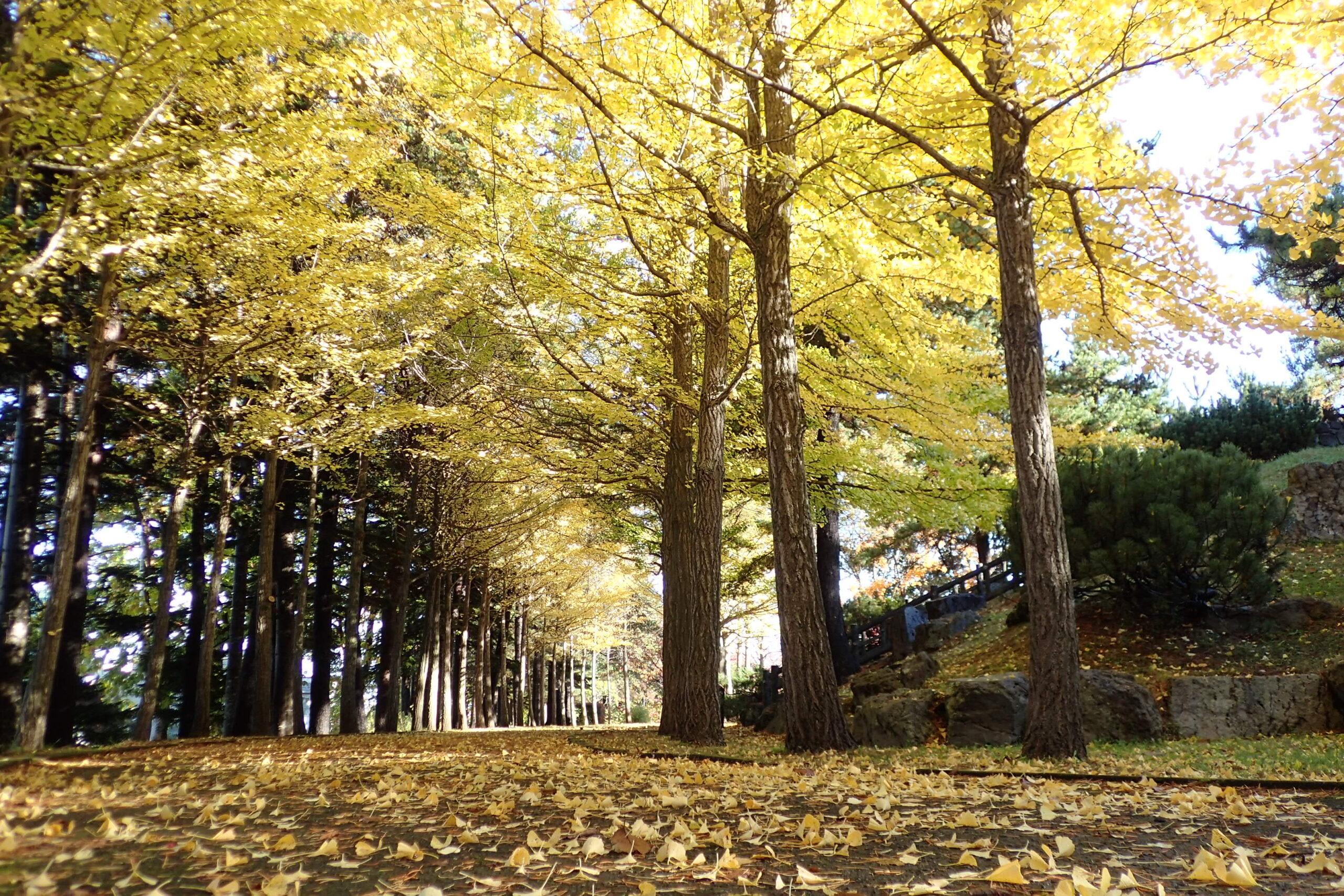 今朝のイチョウ並木の様子です。黄色の葉が明るいです。