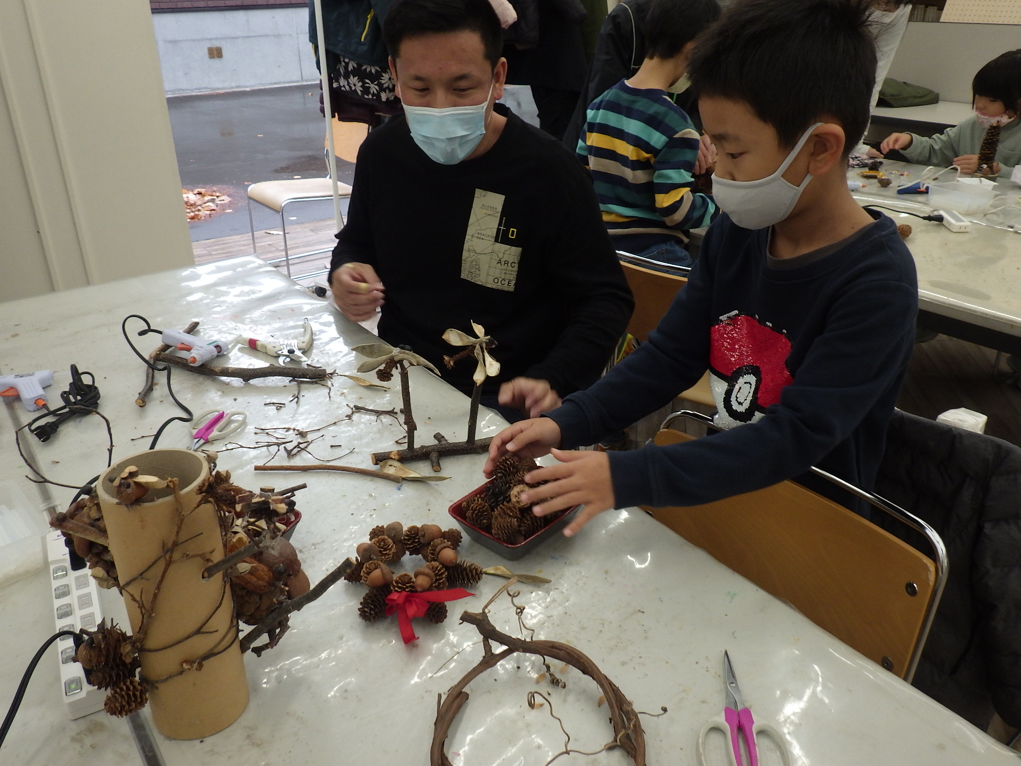 子りす工房は西岡公園の森の材料を使って、大人も子どもも自由に工作できるイベントです。