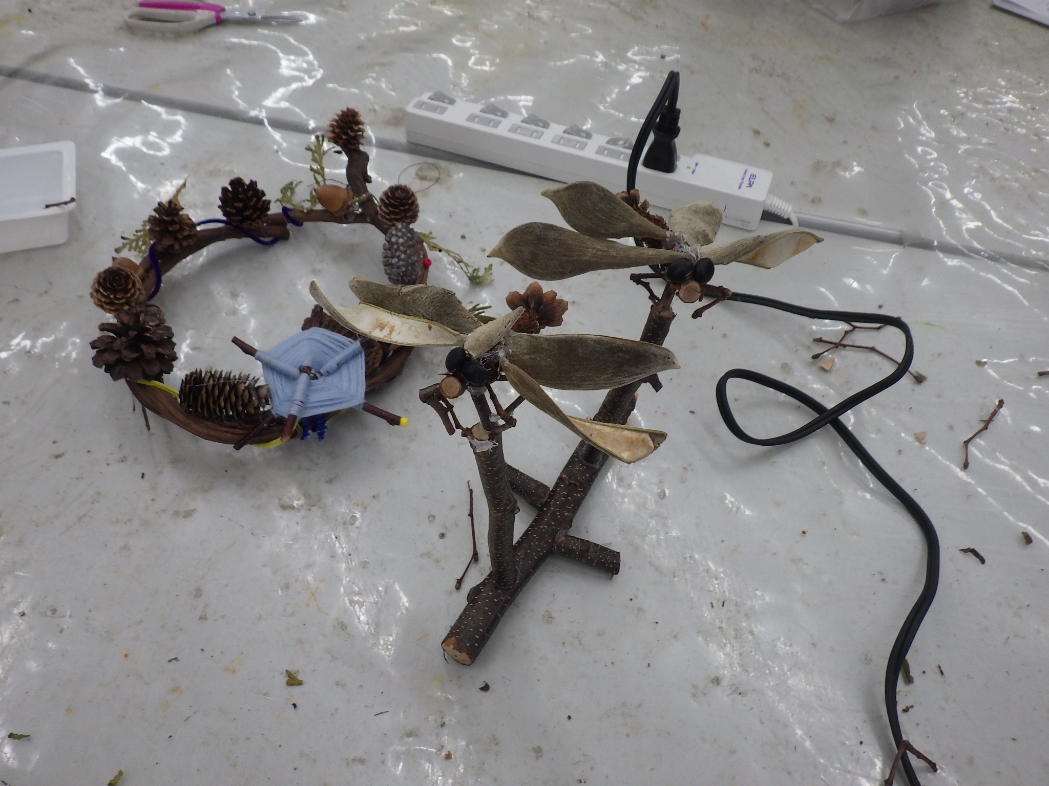 皆さんの力作のリースや、トンボのオブジェです。