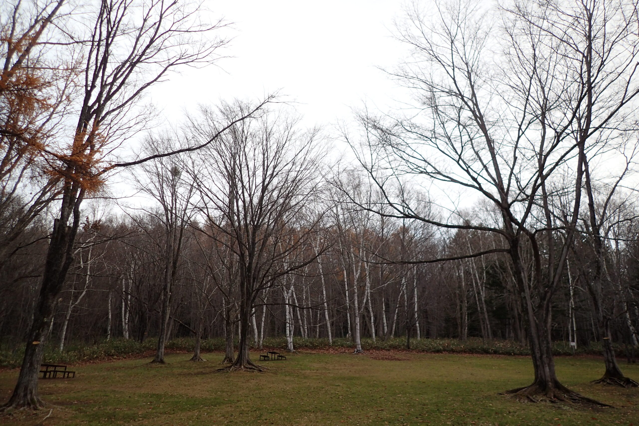 広場の様子です。ほとんどの広葉樹が葉を落として、シラカンバの白い樹皮が引き立って見えます。