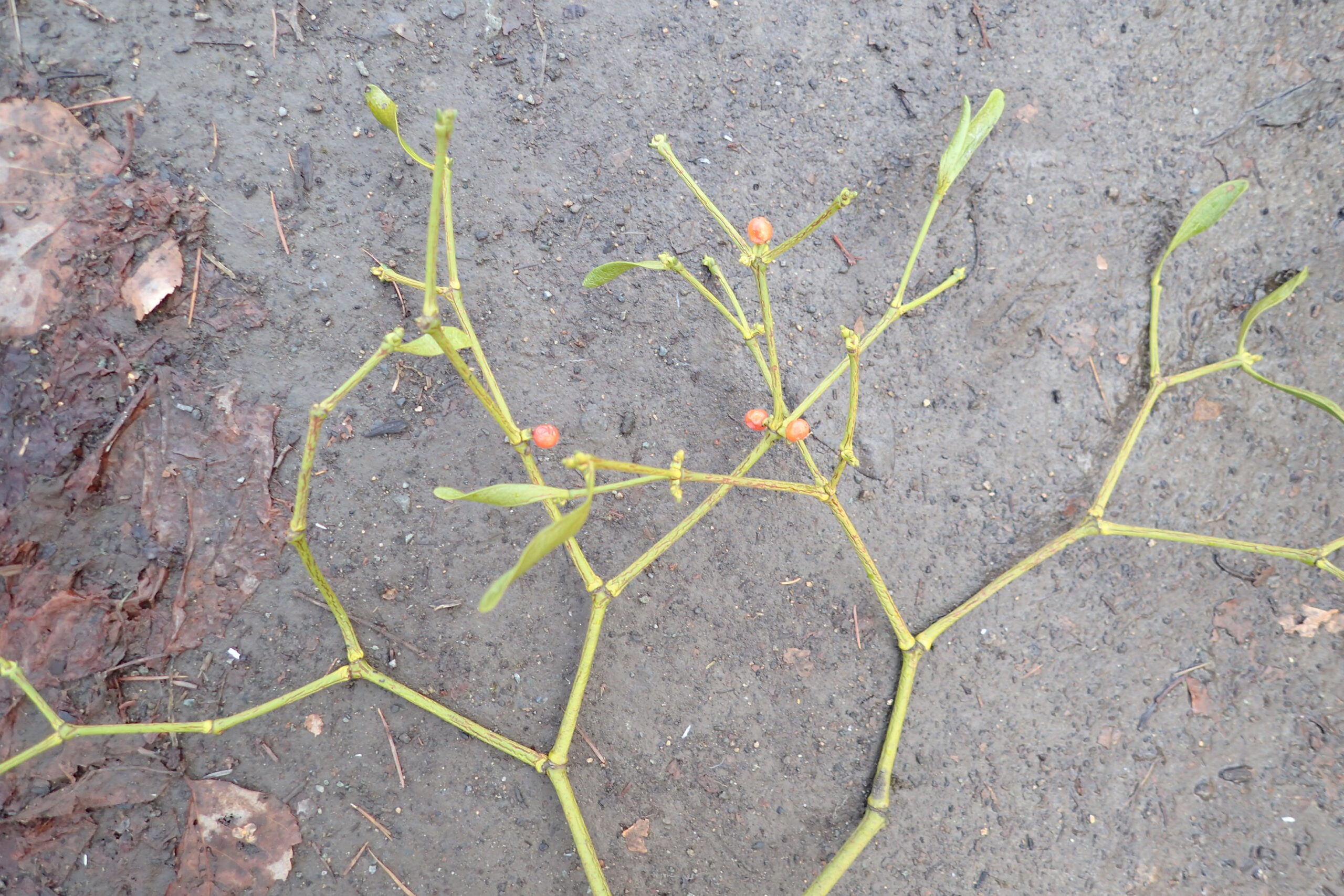 ヤドリギの折れ枝が落ちていました。赤い果実がついています。