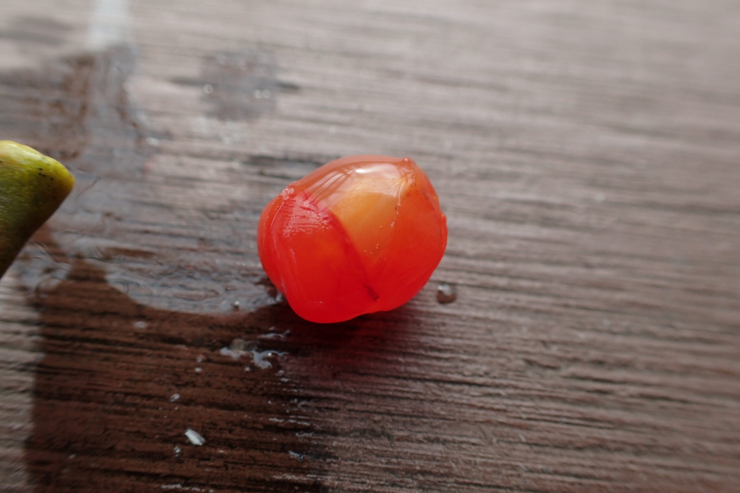 果実が少し割れていて中には透明でネバネバするゼリーのようなものの中に種子が見えました。