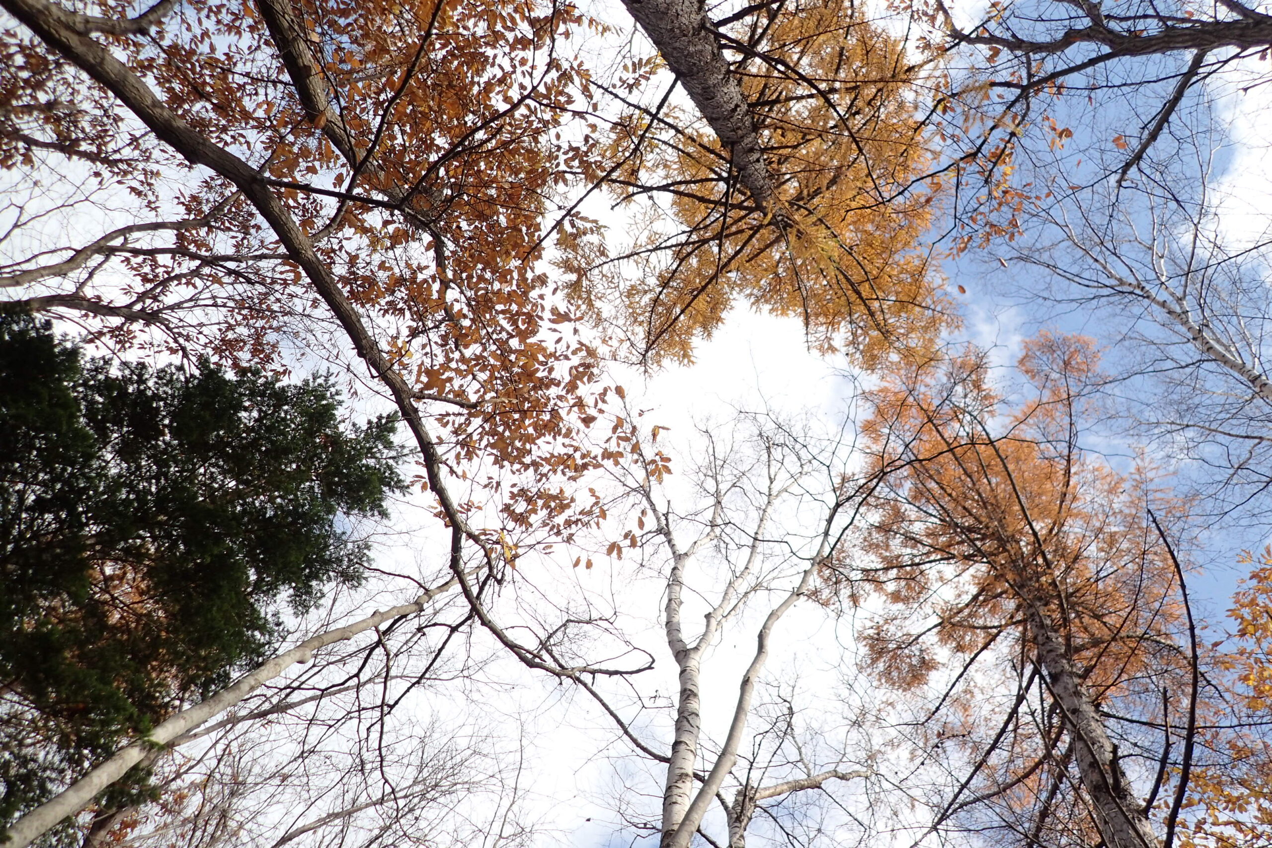 カラマツの黄色い紅葉と、オニグルミの黄色い紅葉、すっかり落葉したシラカンバ、常緑樹のトドマツの深い緑色、その向こうには青空がのぞいていましたよ。
