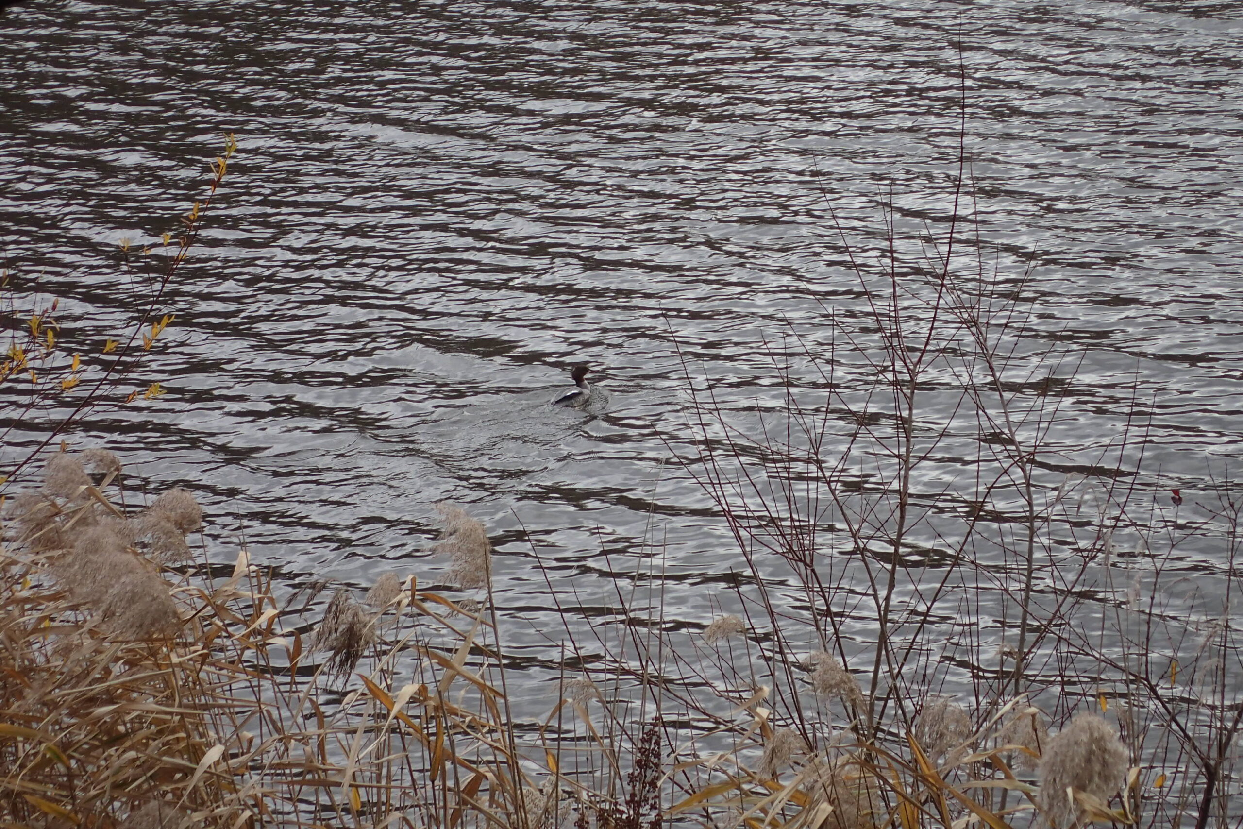 風が吹いていて波立つ池では、カワアイサが3羽潜水して餌を採っていました。