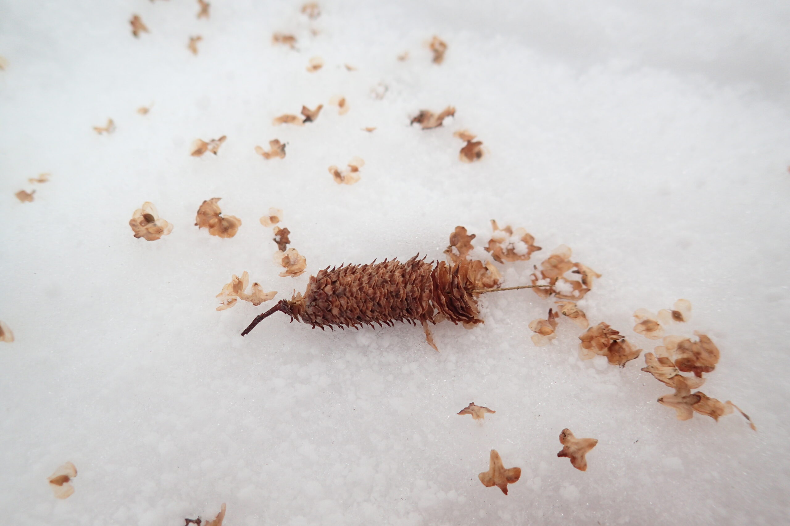 他にも今日は、シラカンバの果鱗や果実が雪の上にたくさん散っていましたよ。